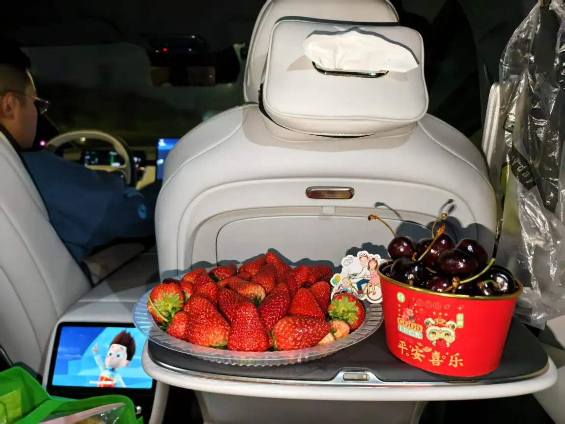 小鹏P7+的另一个亮点是它的小桌板。在堵车时,我们利用小桌板摆放了一些水果,如草莓和樱桃,既方便又实用。孩子们在车上也能享受到新鲜的水果,这让我们的旅程更加愉快。