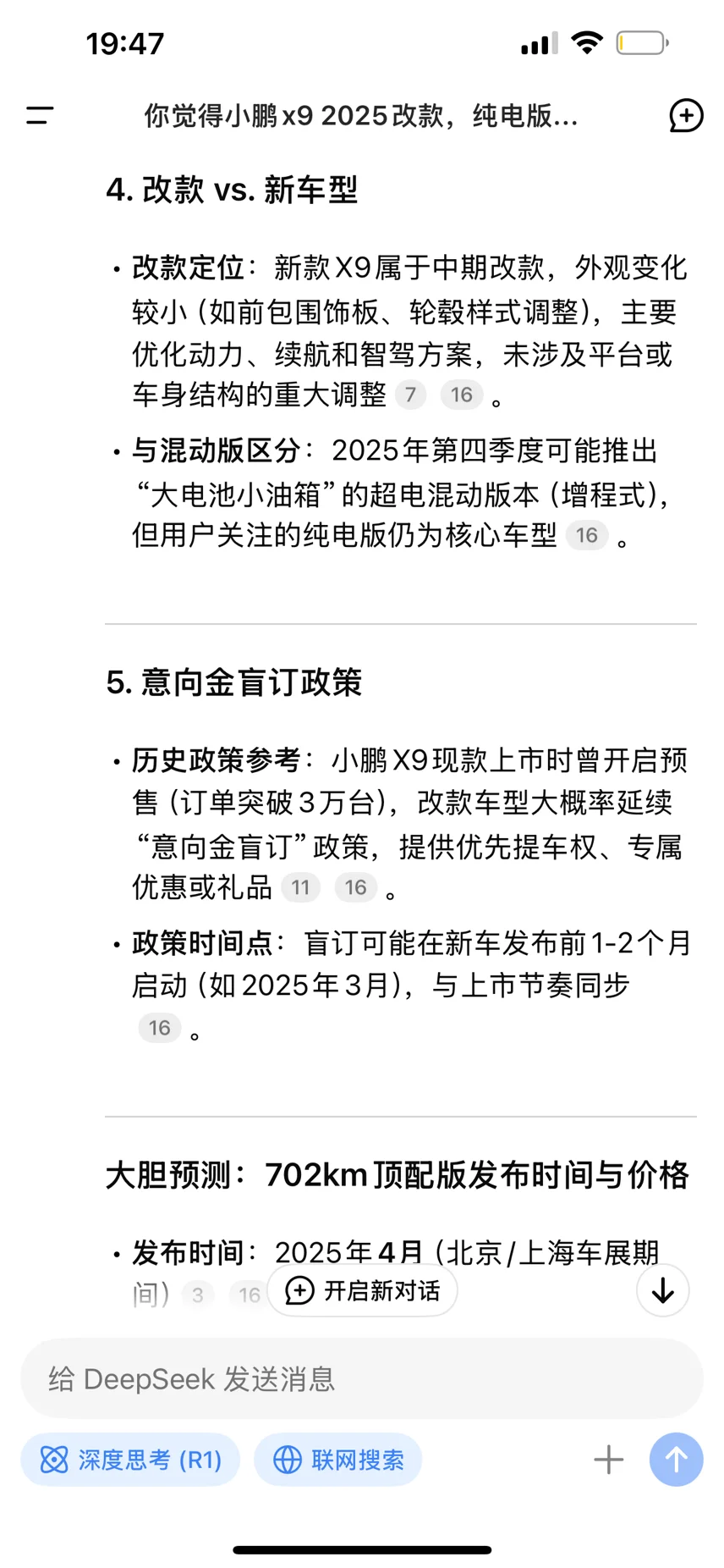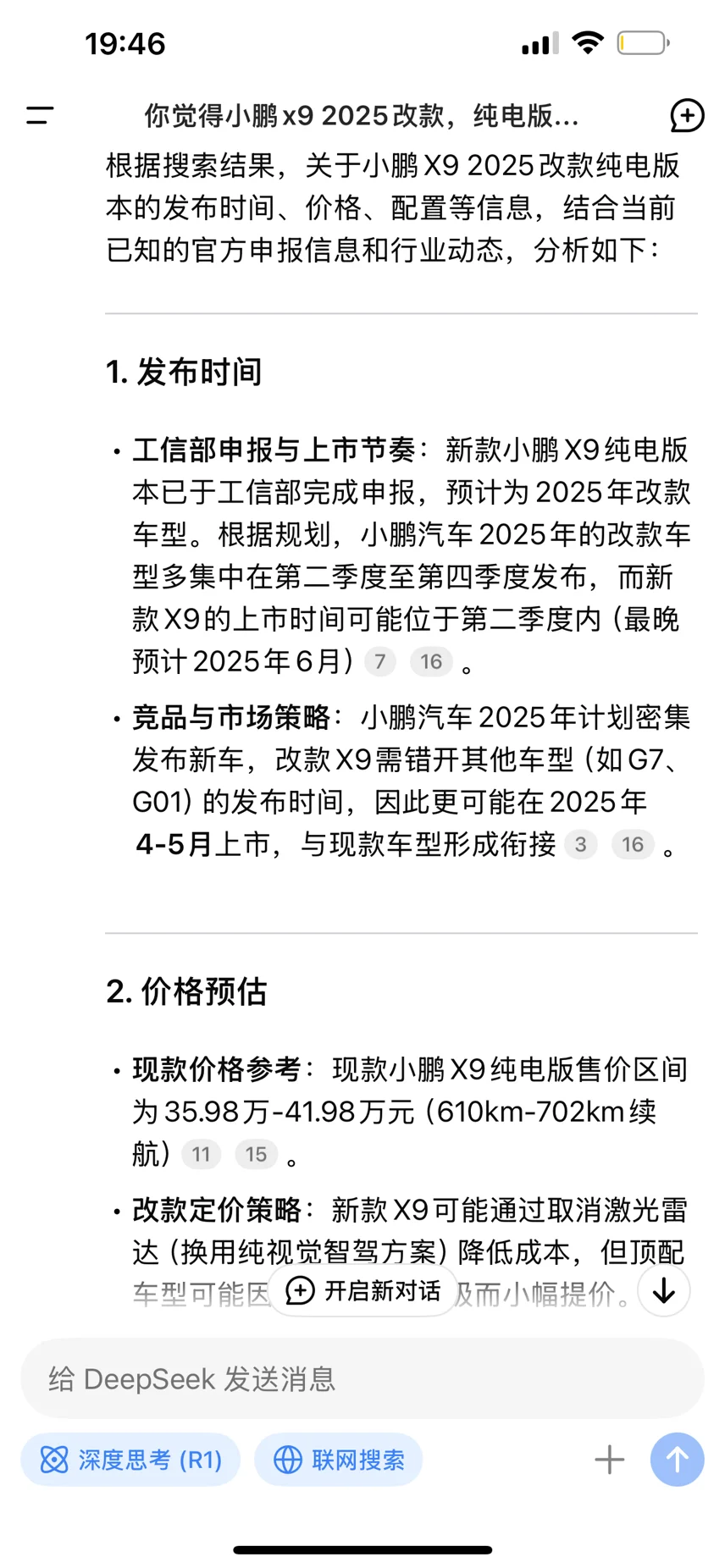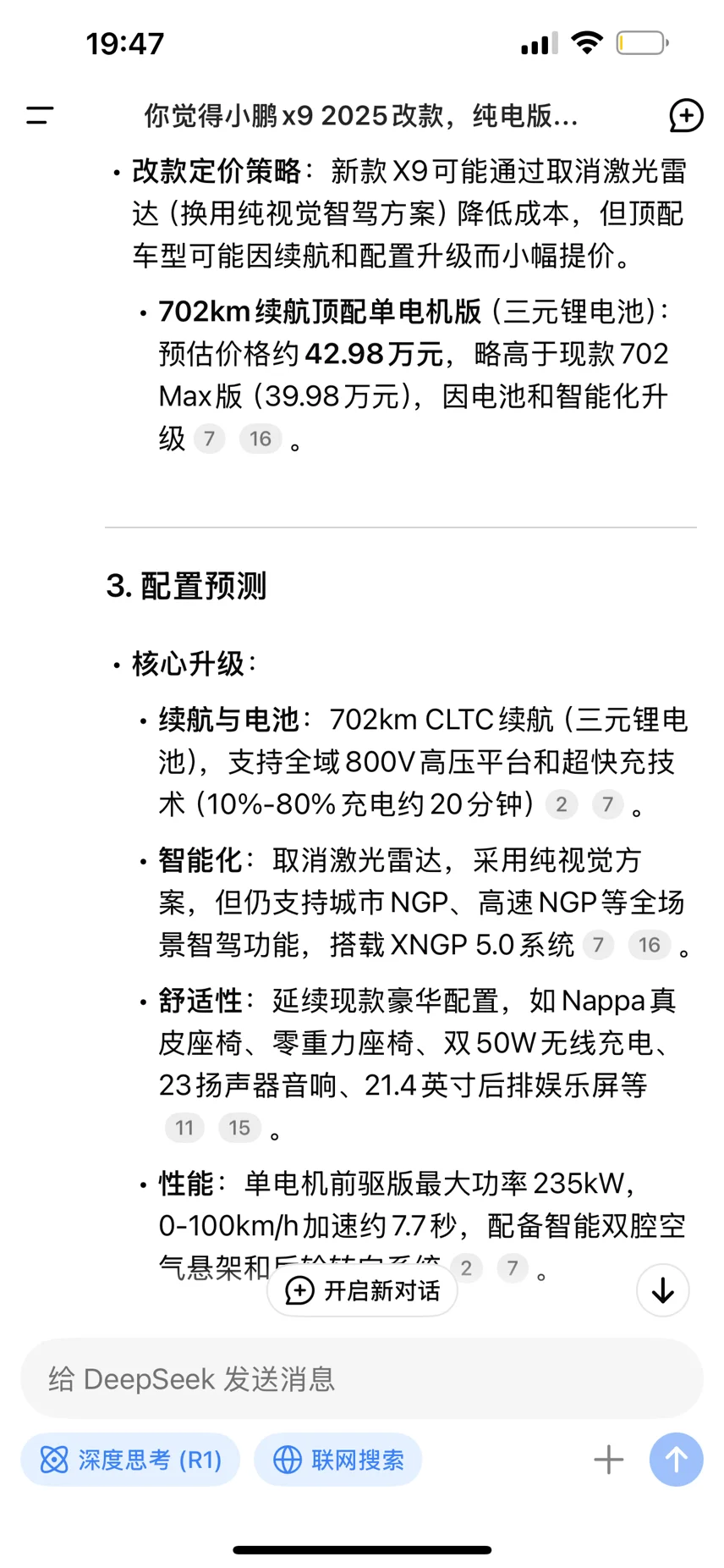 关于价格,deepseek也分析了知道取消了激光雷达,走纯视觉路线,价格会有所降低,但是它居然预测 x9改款的顶配价格会提升?这一点我觉得他可能会猜错了。不过,关于他提到了可能还会有提升的配置和续航,我感觉续航有难度,虽然我很期望可以超越702km,这样一定是一个超大惊喜。