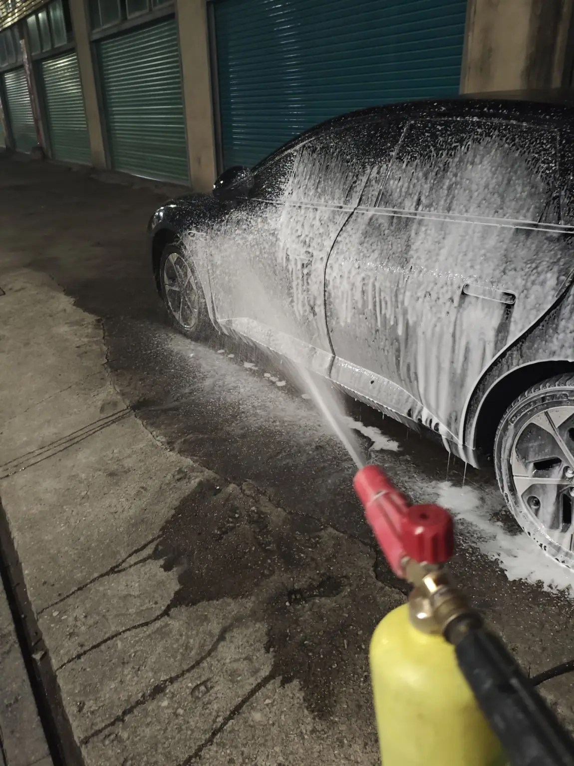 自家开修车厂的好处,体验一波洗车的快感,泡沫枪一喷,高压冲洗枪一冲,洗白白,积灰确实太厚了,拿了毛巾擦了几次才洗干净,洗完充电,回家过年,时速不到120以上电耗都能控制在11左右,27晚上回,全程畅通无阻😏#开着小鹏回家过年#