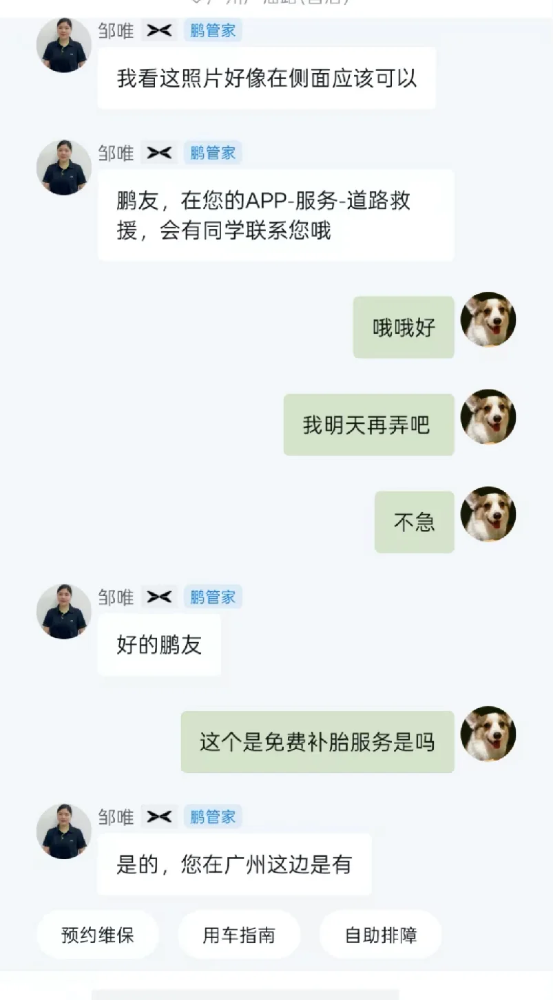 因为这是第一次碰到如此严重的扎钉,而且搜了一下我家附近没有汽修店,也不敢贸然开出门去,生怕开着开着就漏气了,蛮想着问一问鹏管家,意外得知小鹏目前在北京、上海、广州、深圳、杭州、成都六城试点上门补胎服务,最重要的还是免费。👍👍👍