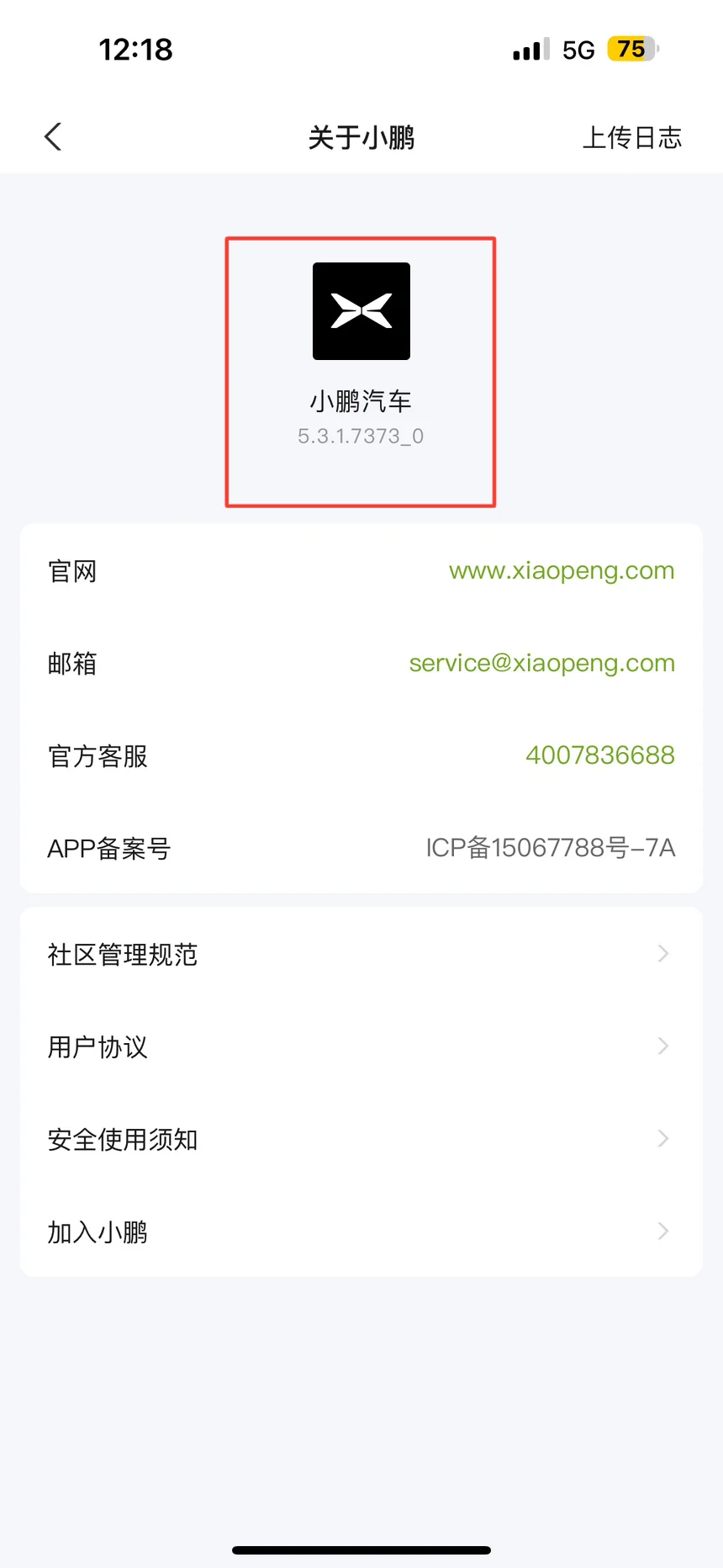 如果这个时候上车,车辆故障灯还是亮的话在小鹏APP中我的,右上角设置⚙️,最下面关于小鹏,点击红色框6次或者在车内呼叫小p上传日志即可,并记录报故障灯时间段,以便于售后同学能在最快的时间内知道车辆发生故障的时间节点去判断是哪一方的原因