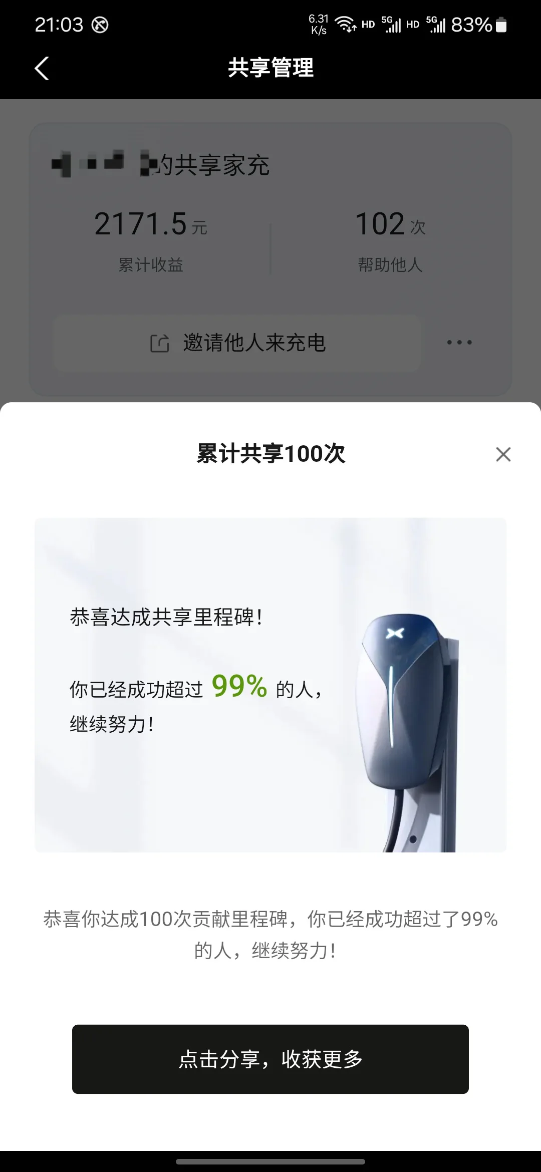 小鹏共享家充内测的时候我就开始用了。到现在已经半年多了,我的充电桩前前后后服务了三位车主,充电102次,收入2171.5元,下面分享下我的心得
