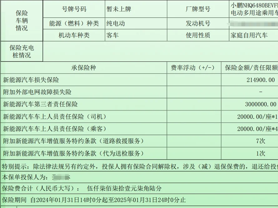 新车第一年保险费用相对较高,我选择了比较全面的保险套餐,交强险950元,商业险(包含车损险、第三者责任险200万等)5771元,总计6721元。这个价格和我咨询的其他车主差不多,不同保险公司和险种选择会对价格有一定影响。不过小鹏官方合作的保险渠道还是比较方便快捷的,在APP上就能直接操作购买,操作方便,购买后又拉了专门的微信群一对一服务,非常的贴心👍。