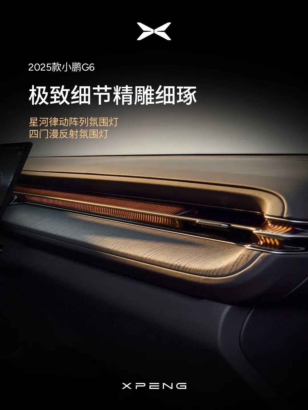 2025款小鹏G6的夜景氛围灯系统通过多项创新设计,重新定义了智能座舱的夜间美学体验: ① 沉浸式动态光效:全新“爆炸星环”氛围灯系统通过多色可调光带与律动阵列设计,配合星空顶投射功能,营造出银河环绕般的流动光影效果,夜间点亮后座舱科技感与神秘感兼备。 ② 智能化交互升级:氛围灯支持256色无极调节,可随驾驶模式、音乐节奏自动切换色彩与亮度,实现“星河律动”的视觉联动,显著提升人车交互的仪式感。 ③ 精致工艺融合:四门漫反射灯带采用隐藏式布局,光线通过超纤绒材质形成柔和漫射,既避免直射眩光,又强化了内饰的层次感与豪华质感。这些升级使G6的夜景氛围灯不仅满足功能性需求,更成为彰显科技美学的核心设计语言。#小鹏汽车#