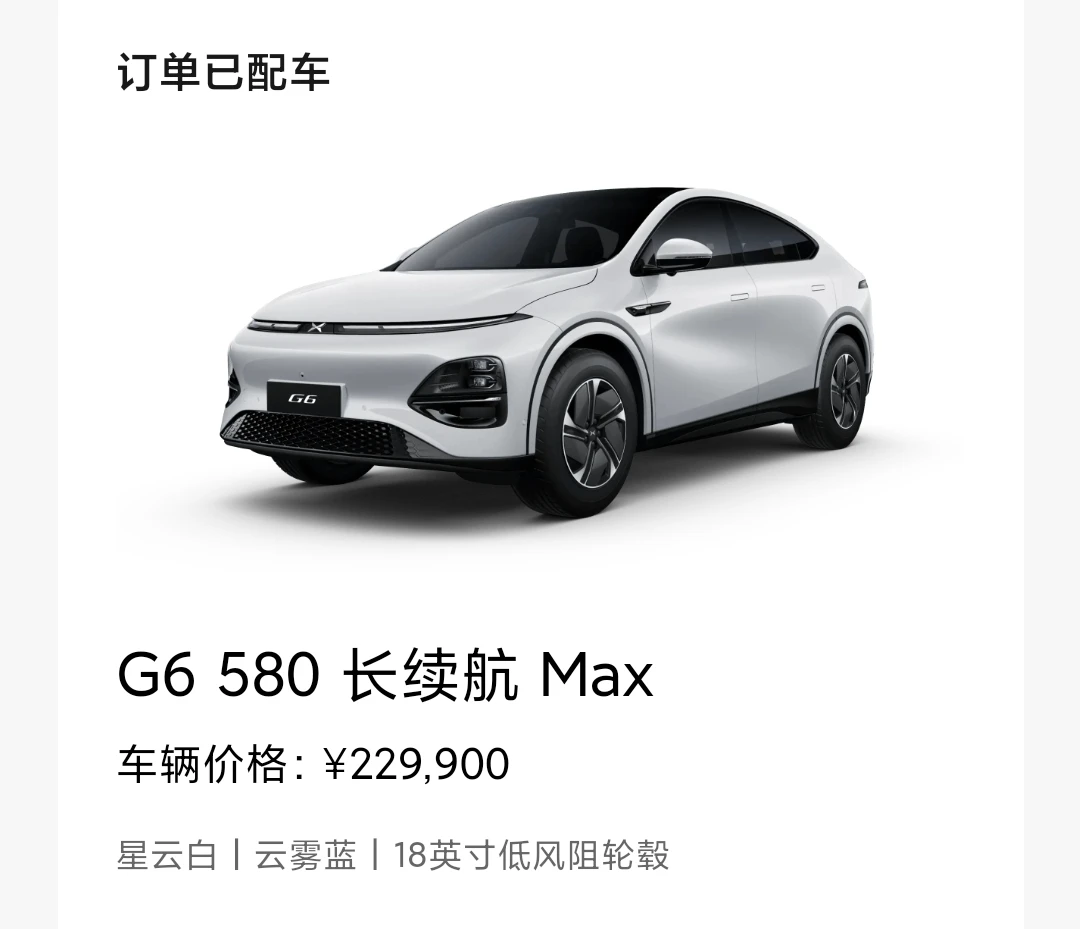 #晒全新小鹏G6G9大定锁单# 历时3个半月,从其他品牌(我研究了不下5.6个品牌的新能源车)到小鹏,从m03到G6,最终定了580版。主要是看中了智驾和与智驾相配套的硬件。试驾了m03和p7,直到提车当天才试驾了一下G6,很有趣。喜欢一台车,其实就是一种缘分。