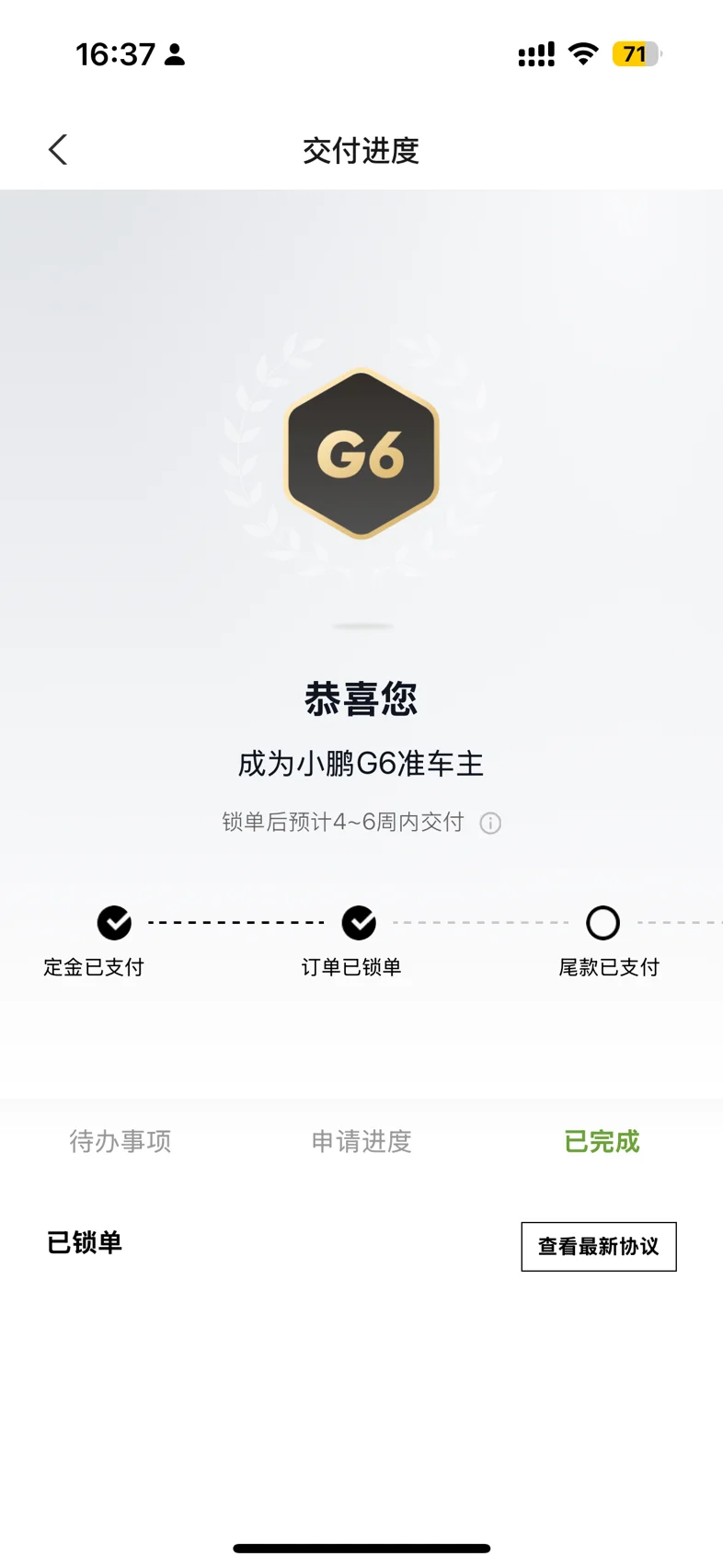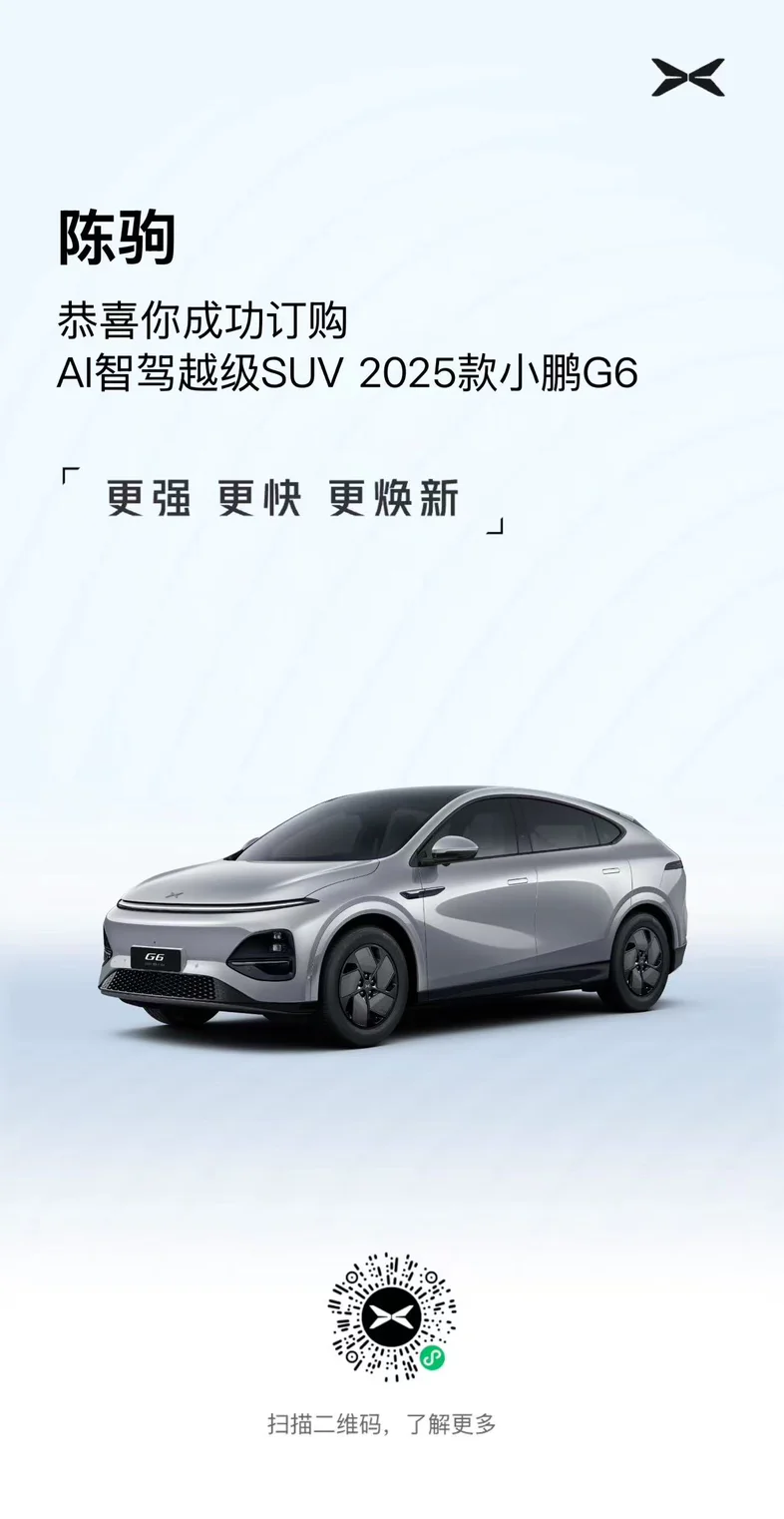 作为G3老鹏友,其实一直都有关注小鹏新车尤其G6的动态!G6其实作为家用SUV,无论空间还是使用场景都于我都非常合适,老G6上市的时候我也在发布会现场,不过当时体验过感觉屏幕尺寸和一些细节确实有不少槽点并未入手!但是,大师兄后续确实听劝,这波发布的2025款新G6,从车头贯穿灯、屏幕尺寸、前排座椅通风加热按摩腰托以及流媒体后视镜(彻底抵消G6后挡风玻璃太小带来的传统后视镜视线不足问题),氛围灯等细节也做了调整变得非常舒适!科技平权也是非常优秀的消费者选购措施,3款车型标配图灵AI智驾,车机芯片升级8295,也是满足目前智驾场景的最优智选!前天去试驾了新G6,625km续航Max旗舰版,流媒体后视镜真的很有必要,因为3个版本差异非常少了,对于我而言,非常重视开车音乐的人,18个音箱非常重要,驾驶员专用音箱也是非常有必要,所以的所以!文章📃最后的最后,想说这波小鹏真的赢麻了,从那天去番禺天河城门店试驾看到好多人就知道新款G6有多火🔥!祝愿小鹏销量节节攀升,销量就是王道,销量代表鹏友们的用车保障!一齐加电🫡#晒全新小鹏G6G9大定锁单# @鹏友值小助手 @鹏友大管家 @飞天神鱼 @小鹏友 @Tracyyi @🌠黄嘉斌🌏 @顺德女富豪首席司机 @谢永康Ken @悠纪子 @晨曦.P