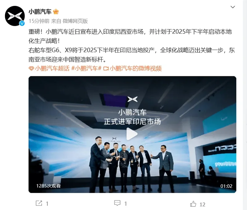中国新能源车又搞大动作啦~小鹏汽车宣布正式进军印尼,东南亚最大汽车市场要被中国智造卷起来啦!💥 印尼不仅是人口大国,2024年新能源车销量暴涨150%,政府还狂推补贴+充电基建,这波天时地利人和,小鹏赢麻了!