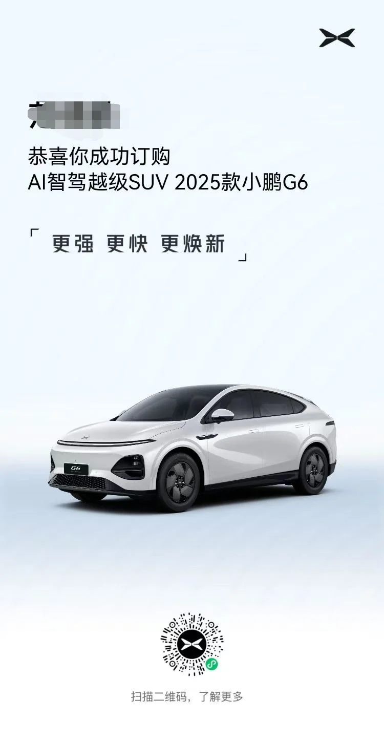 关注小鹏汽车G6其实就是看到发布会的一瞬间,本来计划等固态电池成熟了才换电车,但是看到小鹏G6的配置,空间,价格以后就不淡定了,先买先享受,后买享折扣。活在当下,还是先享受吧!!!
