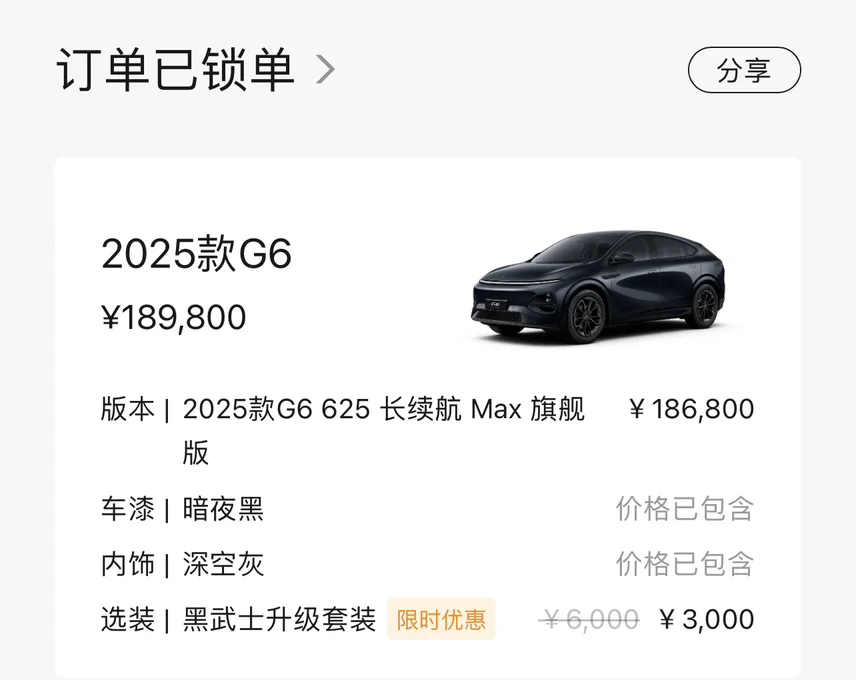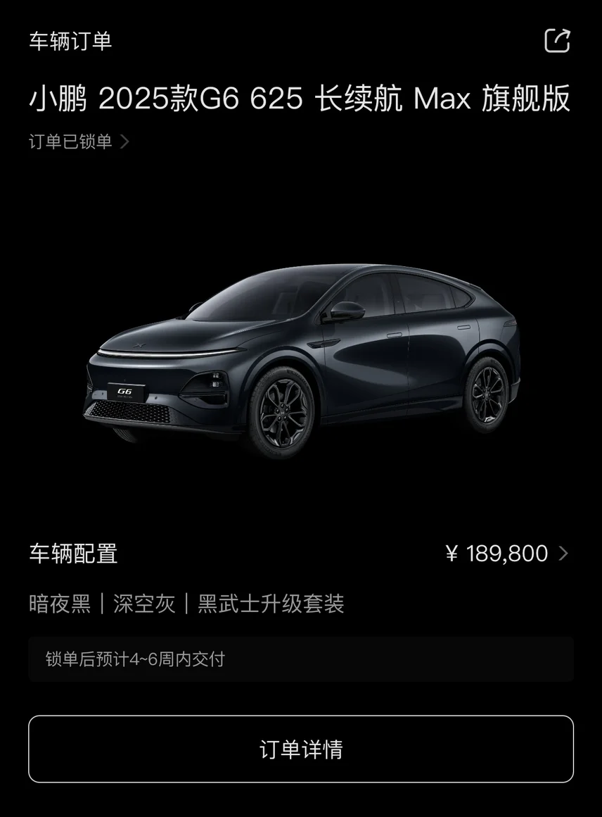 大定车型配置:2025款小鹏G6 625长续航MAX旗舰版(黑武士套装 )