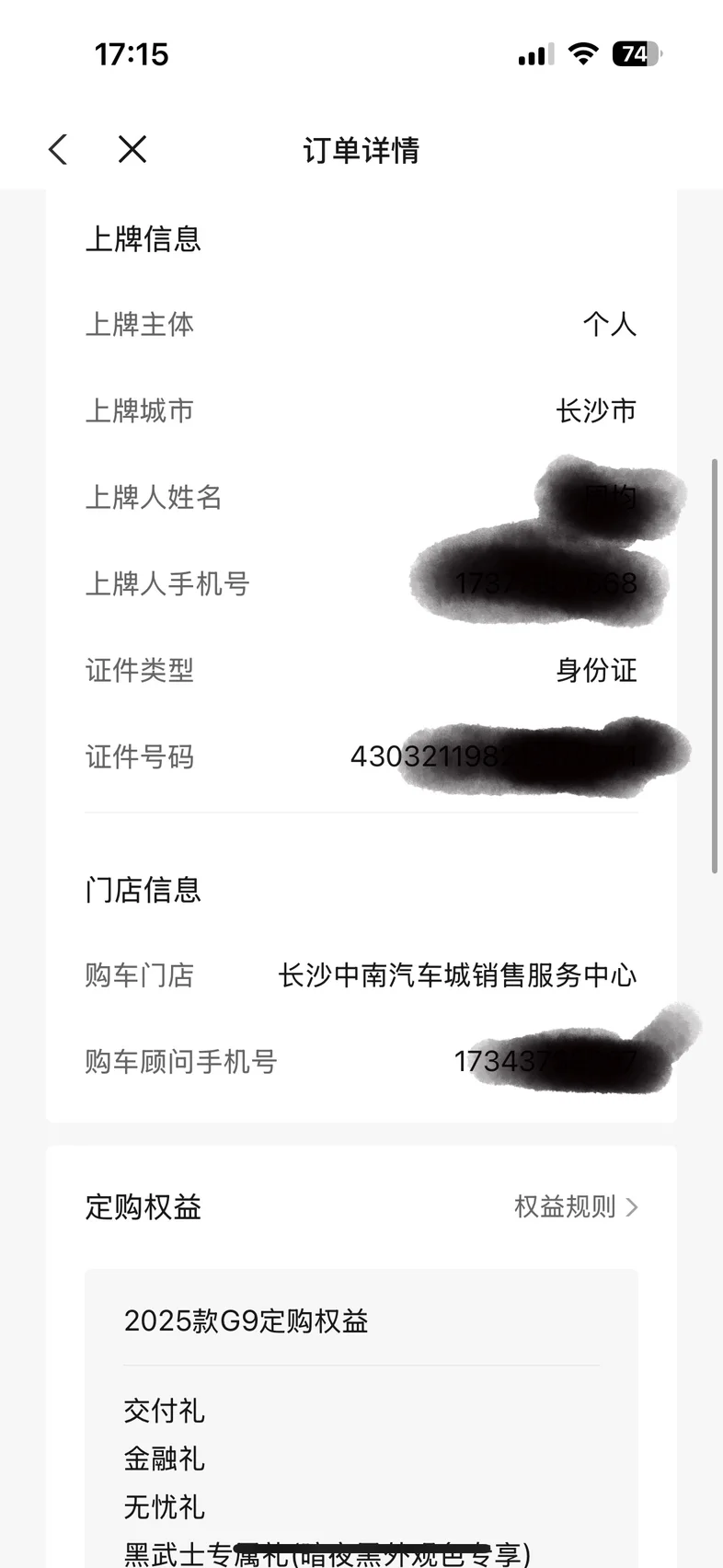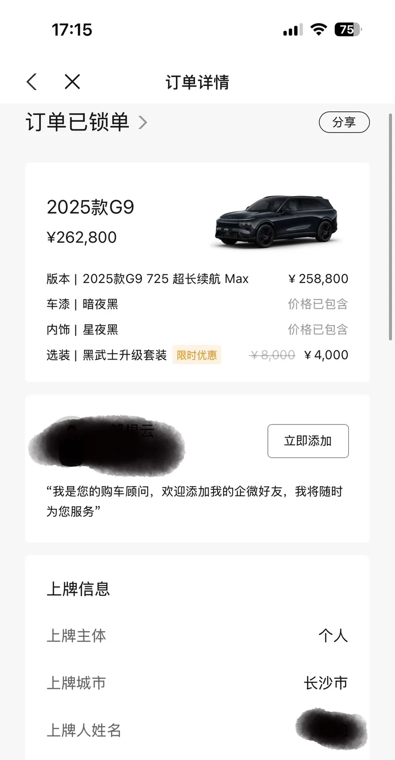 因为购车需求非常明确,要一辆通过性强(底盘高)、全磷酸铁锂(安全)、长续航、偏商务的suv,所以25款g9上市前,特别关注各种信息,还是比较看好,等到正式公布配置,倒是有点担心价格。按照24款优惠完的对应款的配置的价格,预计在26,上限27。结果公布价格,长续航2588,选暗夜2628,就第一时间下定,我应该就在前3000人之一😌