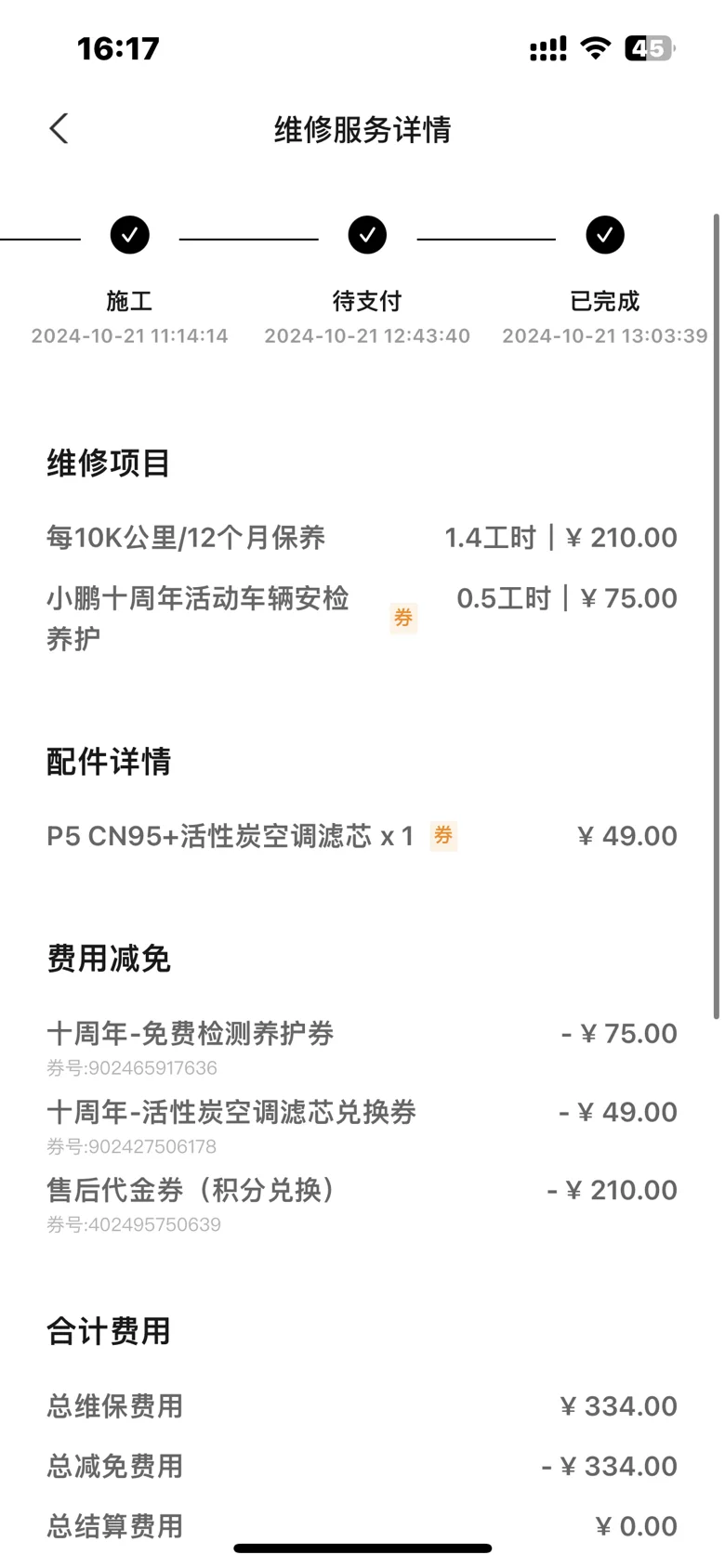 保养的话,新能源车也比燃油车简单太多,基本就是检查一下三电系统,换换空调滤芯啥的,一年保养一次,费用也就几百块,让我最幸福的是积分还得抵扣保养服务。想不到,原来保养也可以不花钱!要给鹏厂一个大大的赞👍🏻!唉呀妈呀,真香!
