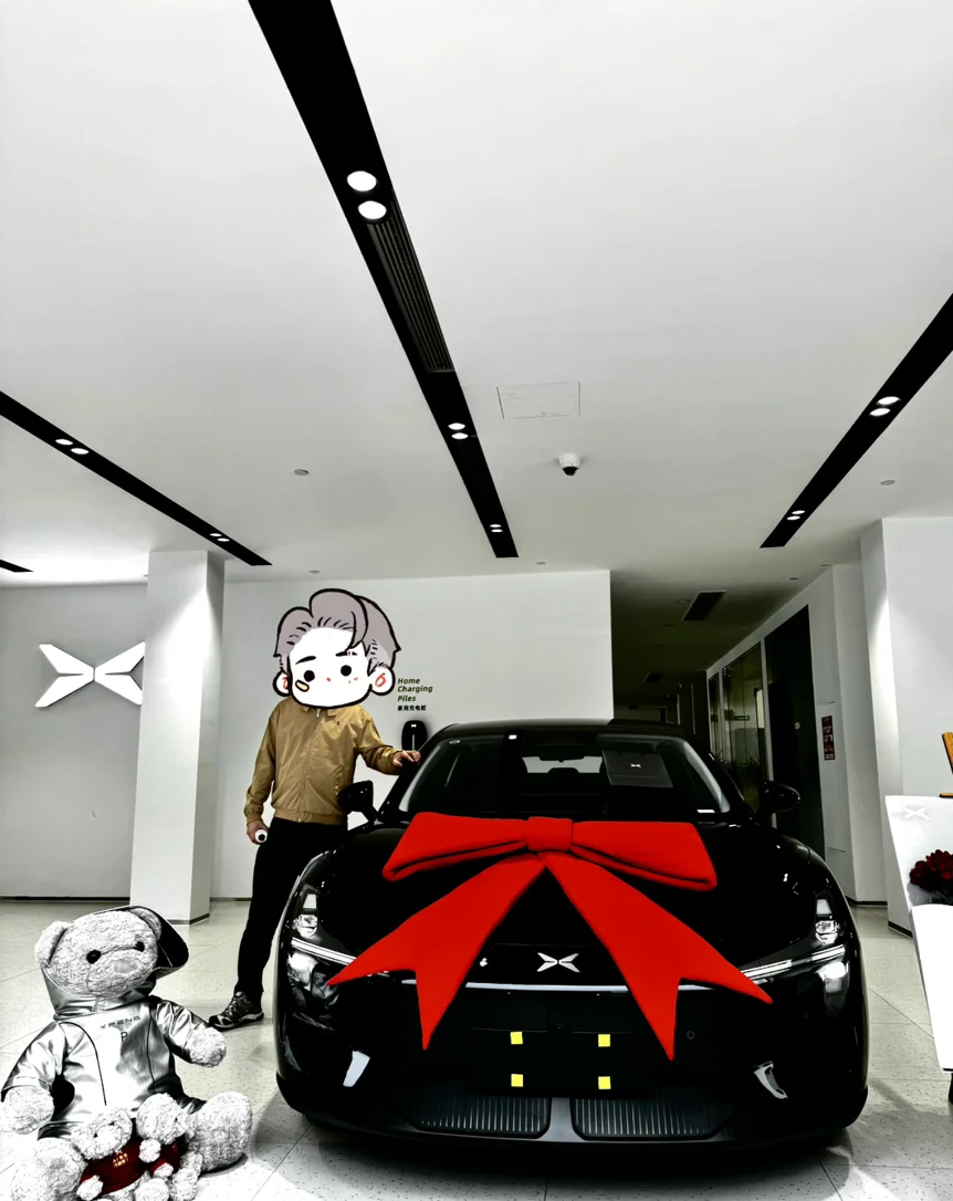 交付当天小鹏安排得超用心!黑色M03车头系着超大蝴蝶结,展厅布置成星空主题,工作人员递上鲜花和小鹏小熊,还帮我们全家拍了纪念照。最惊喜的是车内屏幕显示「欢迎新鹏友」,仪式感直接拉满!