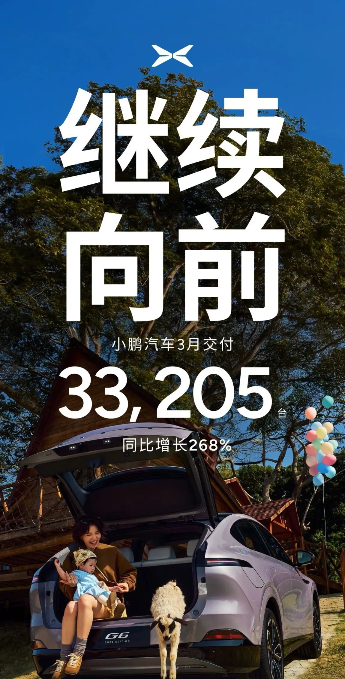 2025年3月,小鹏汽车共交付新车33,205台,。