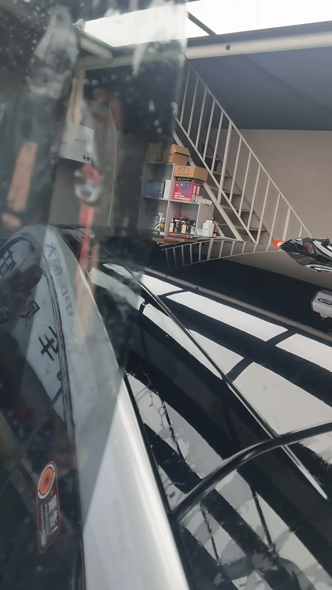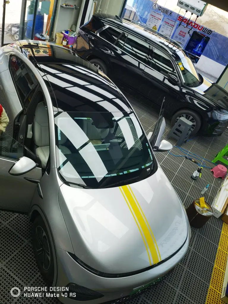 g6的天幕被小石子一下就这么一个小白点砸裂了!可以用车险,但是一想换整个天幕,明年保费可能还会涨,所以去福耀玻璃维修了一下,然后贴了冰甲,冰甲据说只能用3年,但是也贴上总是保险一点!亮黑色很漂亮,顺便换了店里送前风挡膜一点都隔热和遮光,换了70隔热的,看红墙折射的光可以过滤一些挺好,清晰通透!最后找个角度拍了一张帅照!#小鹏潮改玩家#