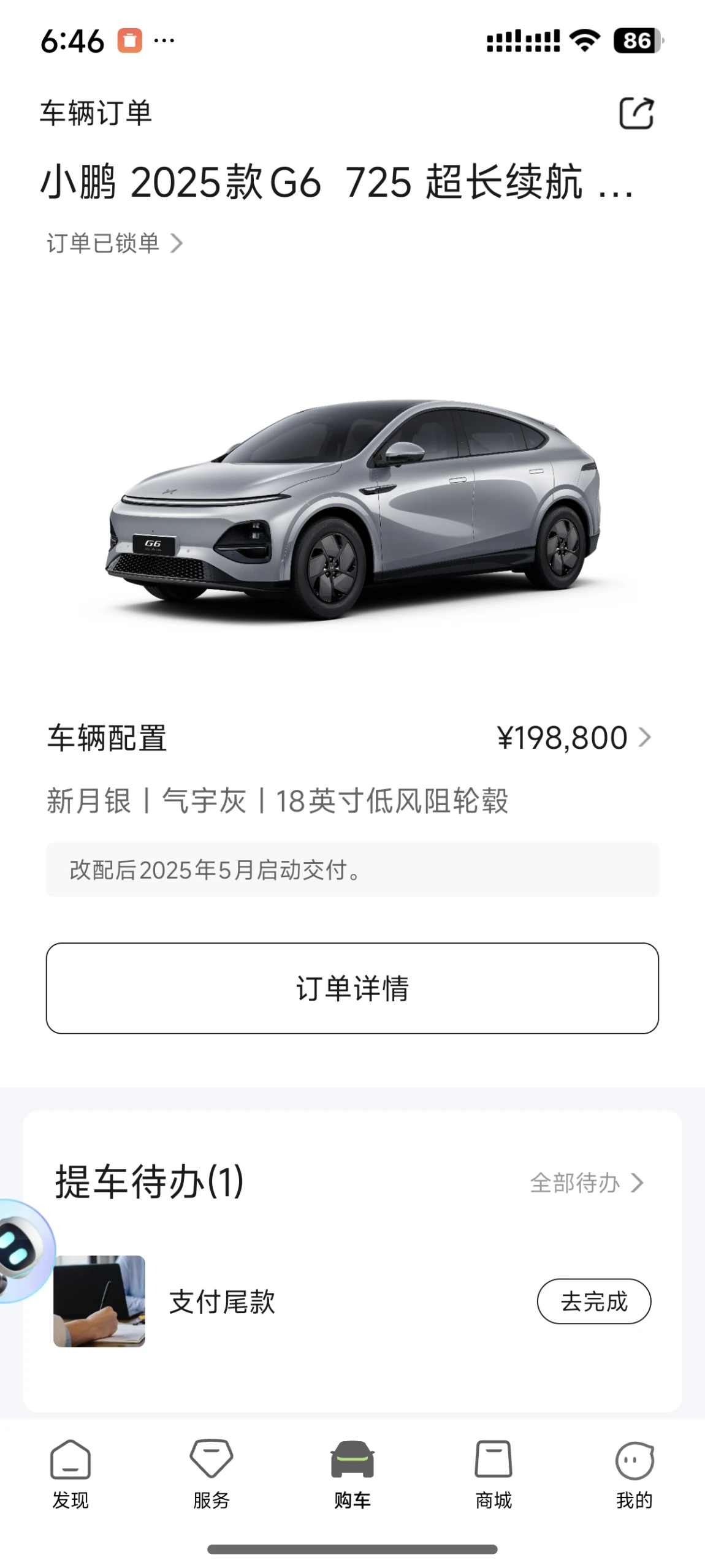 有没有鹏友,725版本G6有生产了的,3月16日下订,目前还是显示5月后交付。希望小鹏加快产能👍