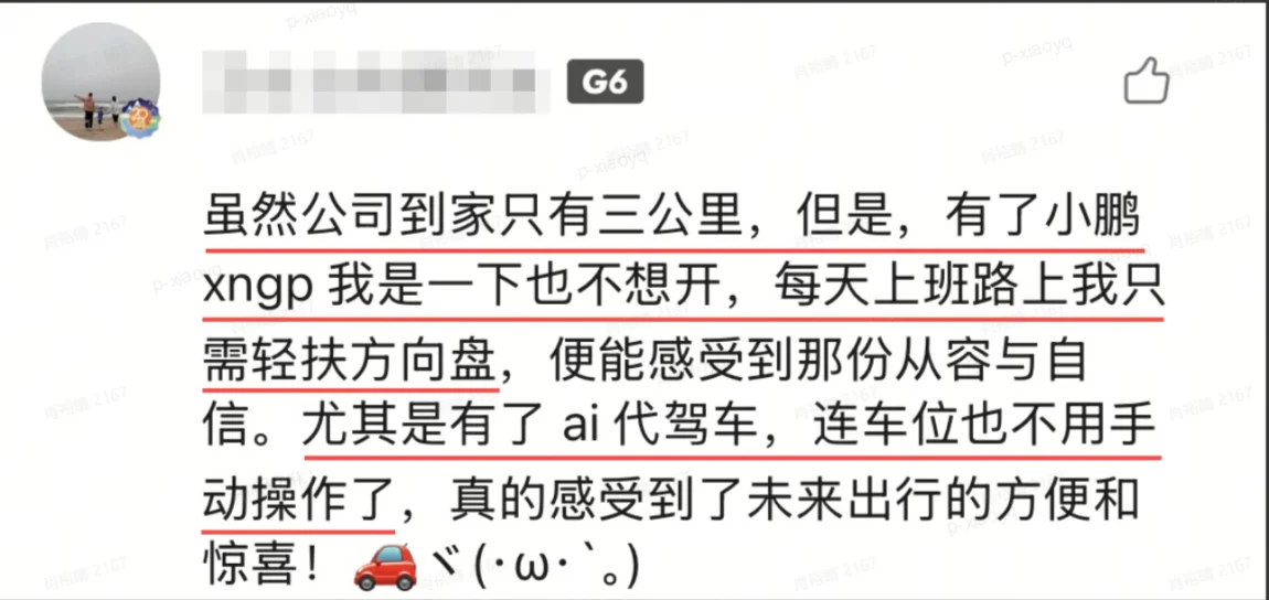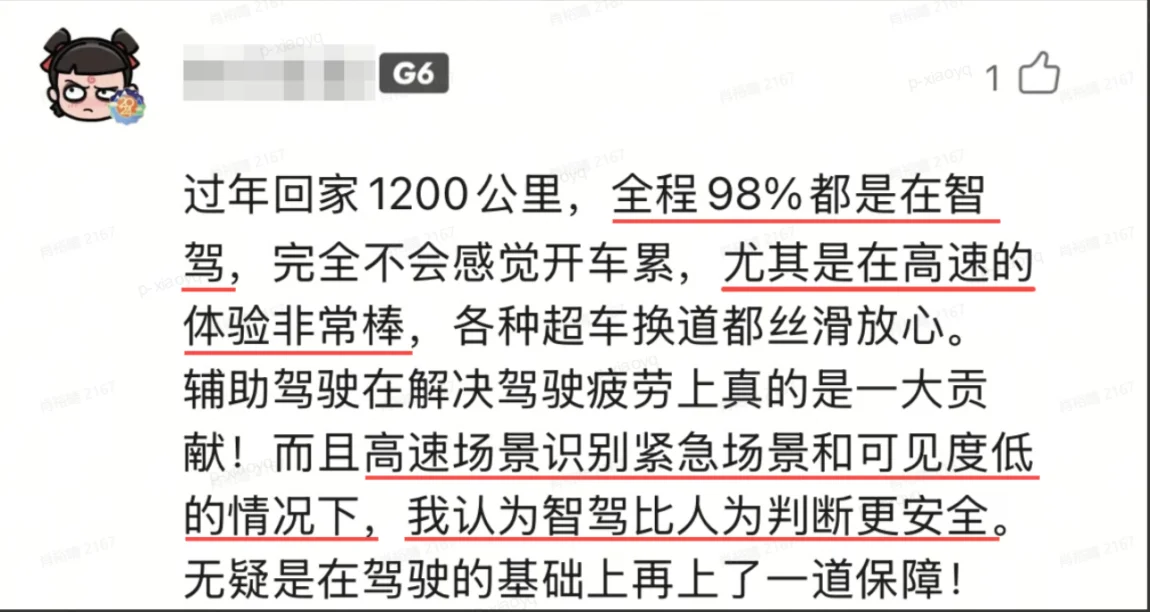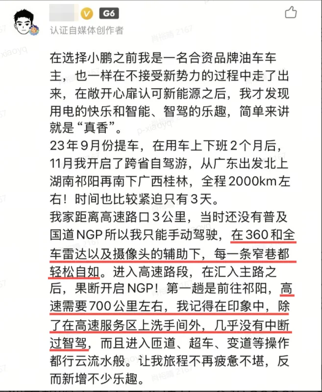 小助手发现在社区里每天都有鹏友分享着自己与智驾的故事:当北京的鹏友在傍晚归途中紧握方向盘时,智驾系统正以积极的响应预判着每一次变道;在深圳早高峰的车流里,鹏友的 G6 正像经验老到的司机般丝滑切入车道;而远在云南的鹏友,正用 2700 公里的智驾旅程重新定义 "诗与远方"......