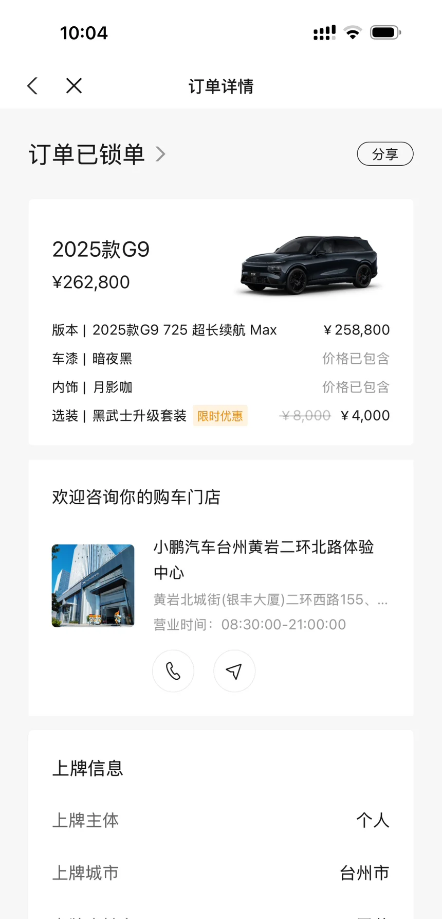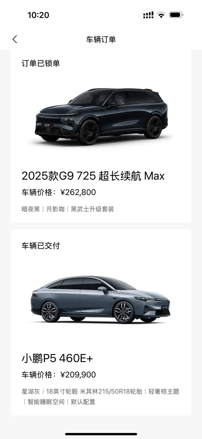 #晒全新小鹏G6G9大定锁单# 这是第二次购买小鹏了。作为小鹏的老客户,三年前,第一次购买新能源汽车,第一眼便相中了小鹏,作为自己首辆家庭用车,P5的空间和颜值是最打动我的。然后在三年的使用中,无论是车机,驾驶辅助,城市驾驶乐趣,都让我非常满意。一辆20万的家用轿车,拥有当时起码50万起步燃油车的动力和功能,什么大灯随动转向这些一般在百万级别豪车上的配置,他都拥有。当然,作为一个男人,有一辆SUV是我的梦想。但是碍于当时的经济实力,30万起步的新能源SUV我只能看看。直到最近直到小鹏G9新款在配置更加高的基础上,价格却更加新民了,我毫不犹豫的再次选择了小鹏。让我们和小鹏一起,一直进步,越来越好。