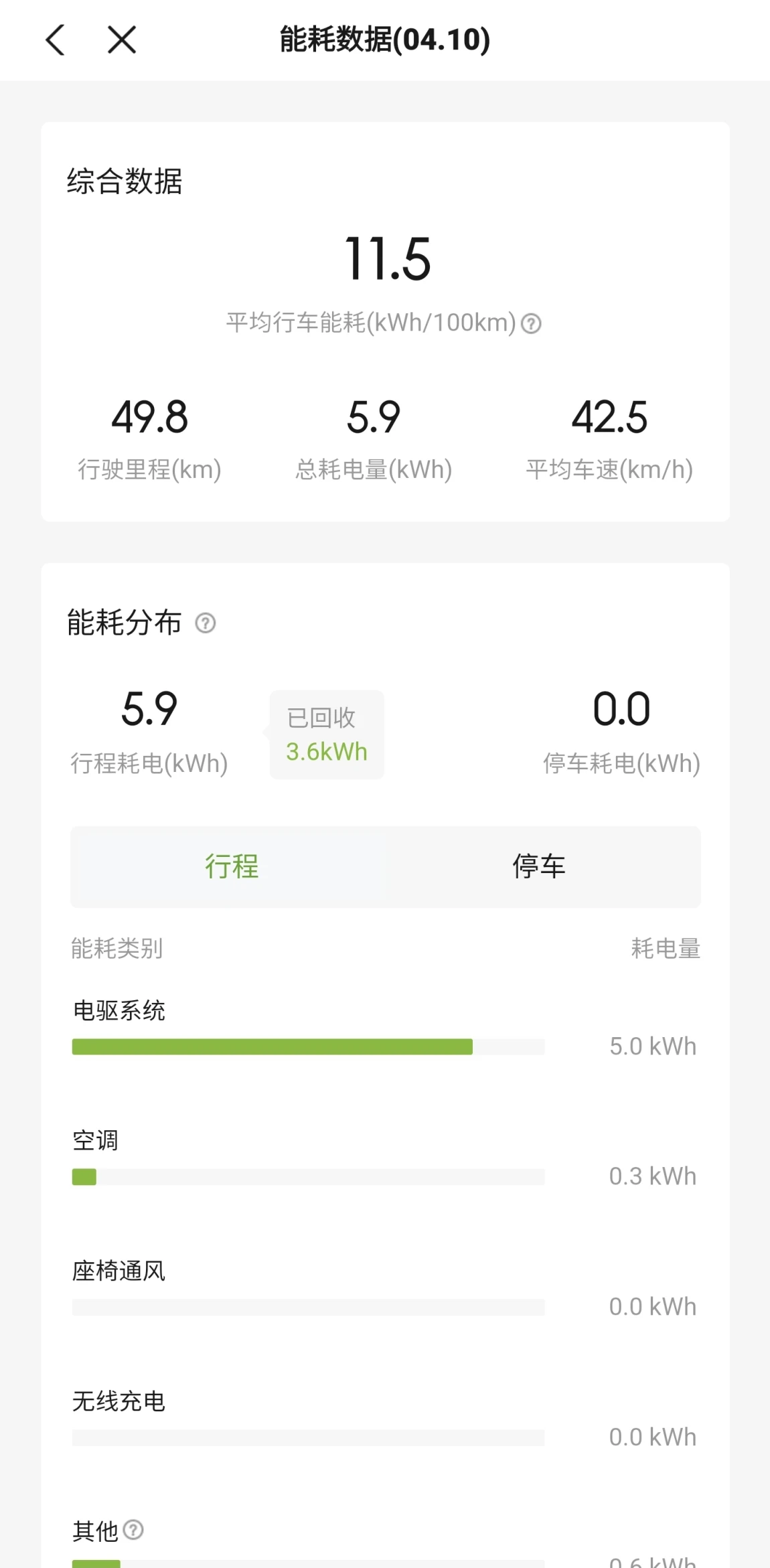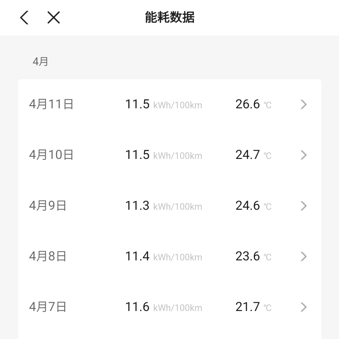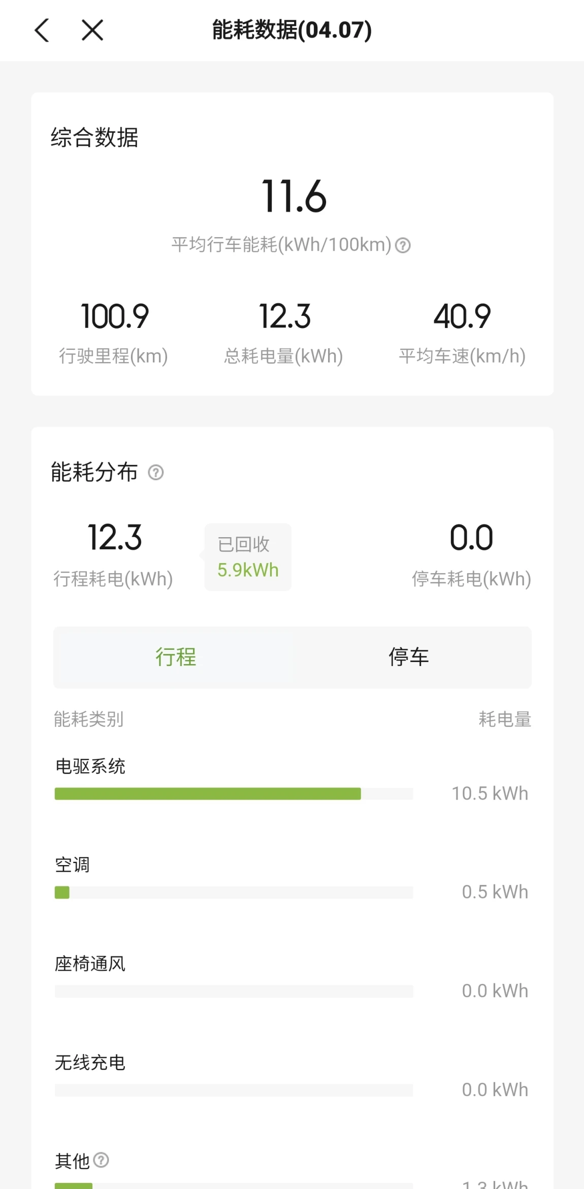 上周5天通勤平均电耗,单程50公里左右,没有一天超过12kw/百公里!