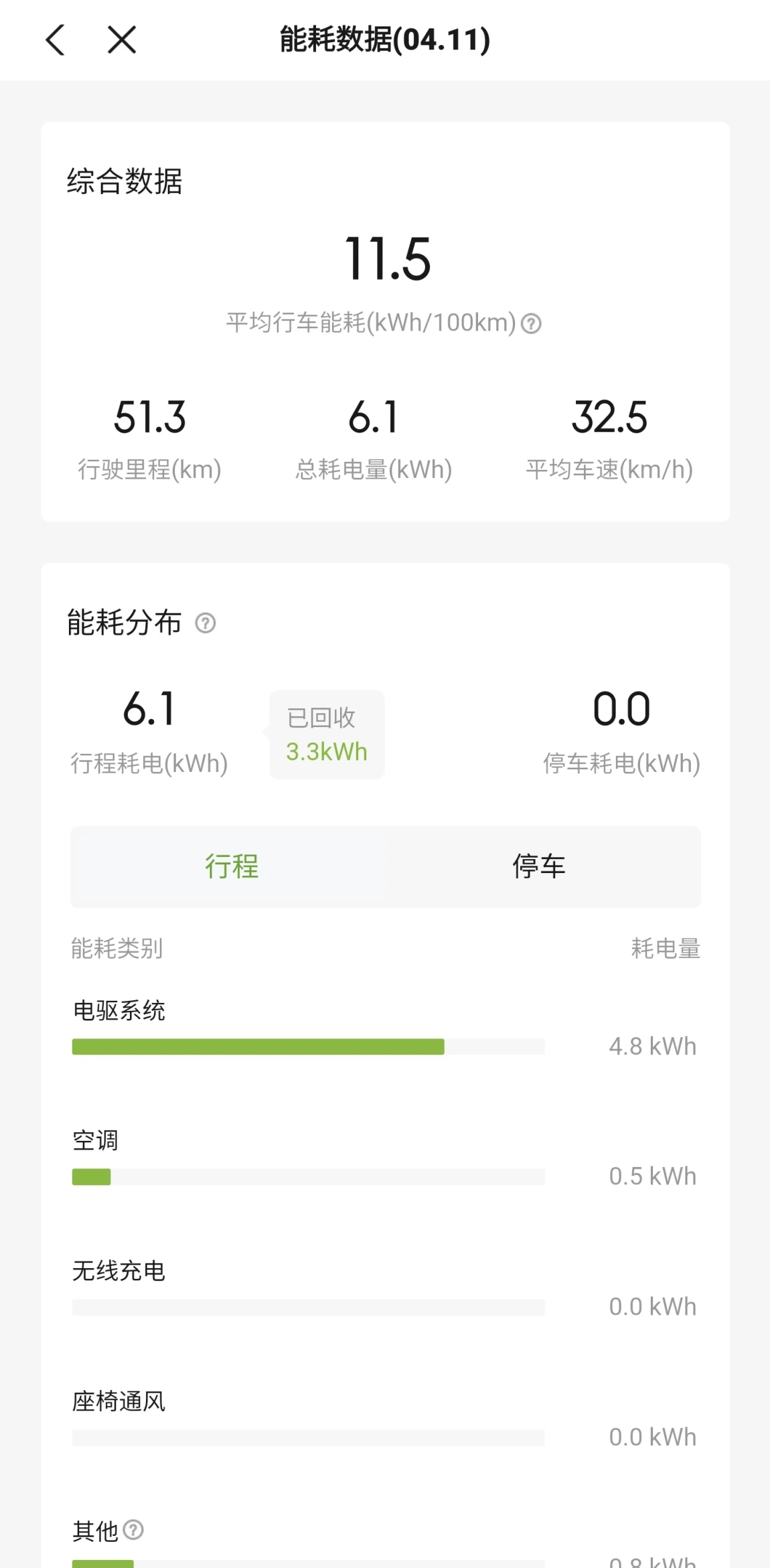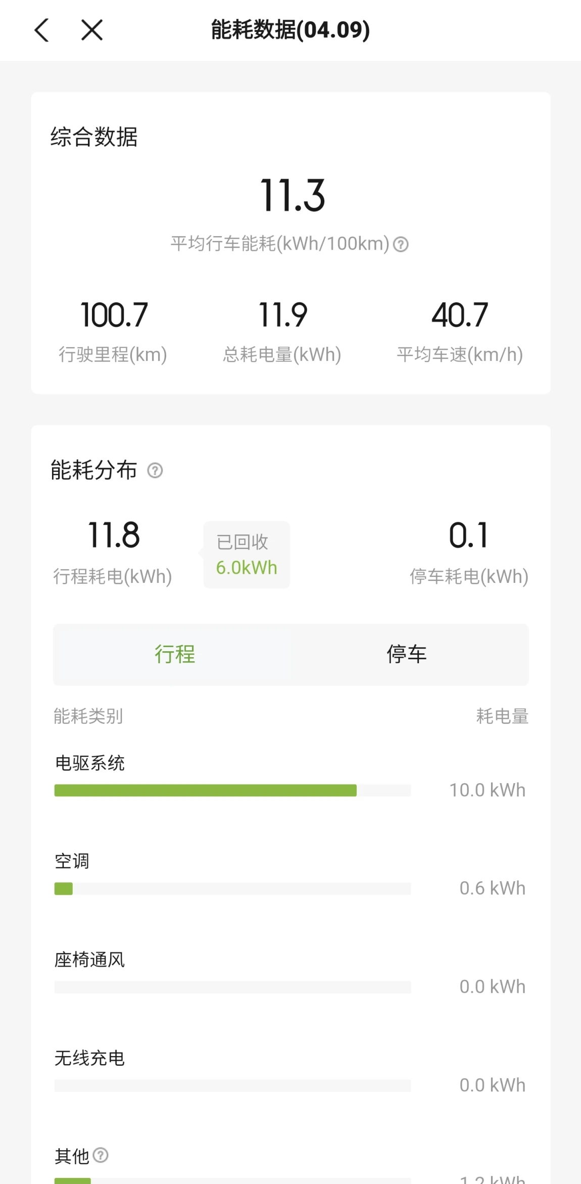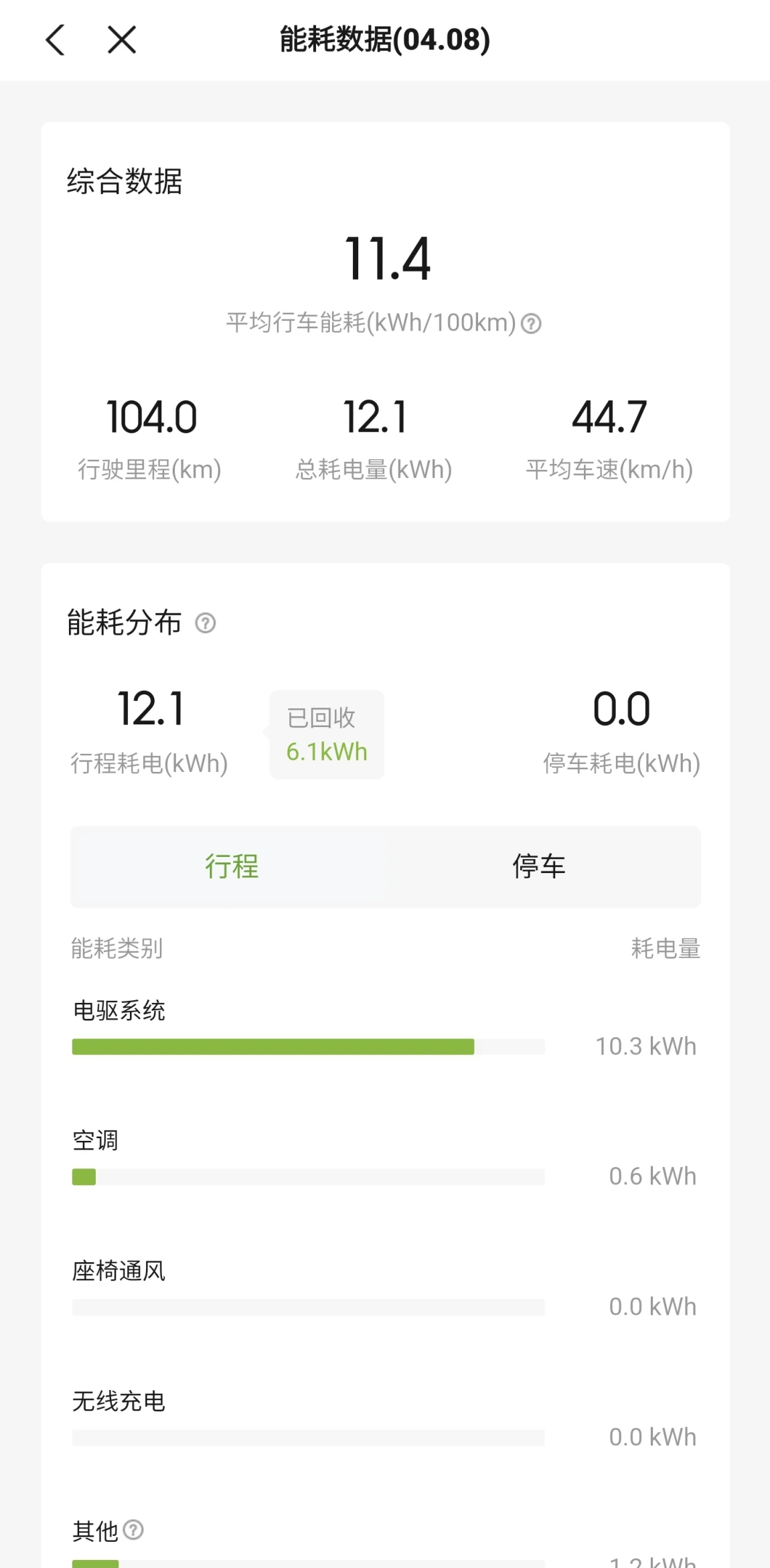 上周5天通勤平均电耗,单程50公里左右,没有一天超过12kw/百公里!