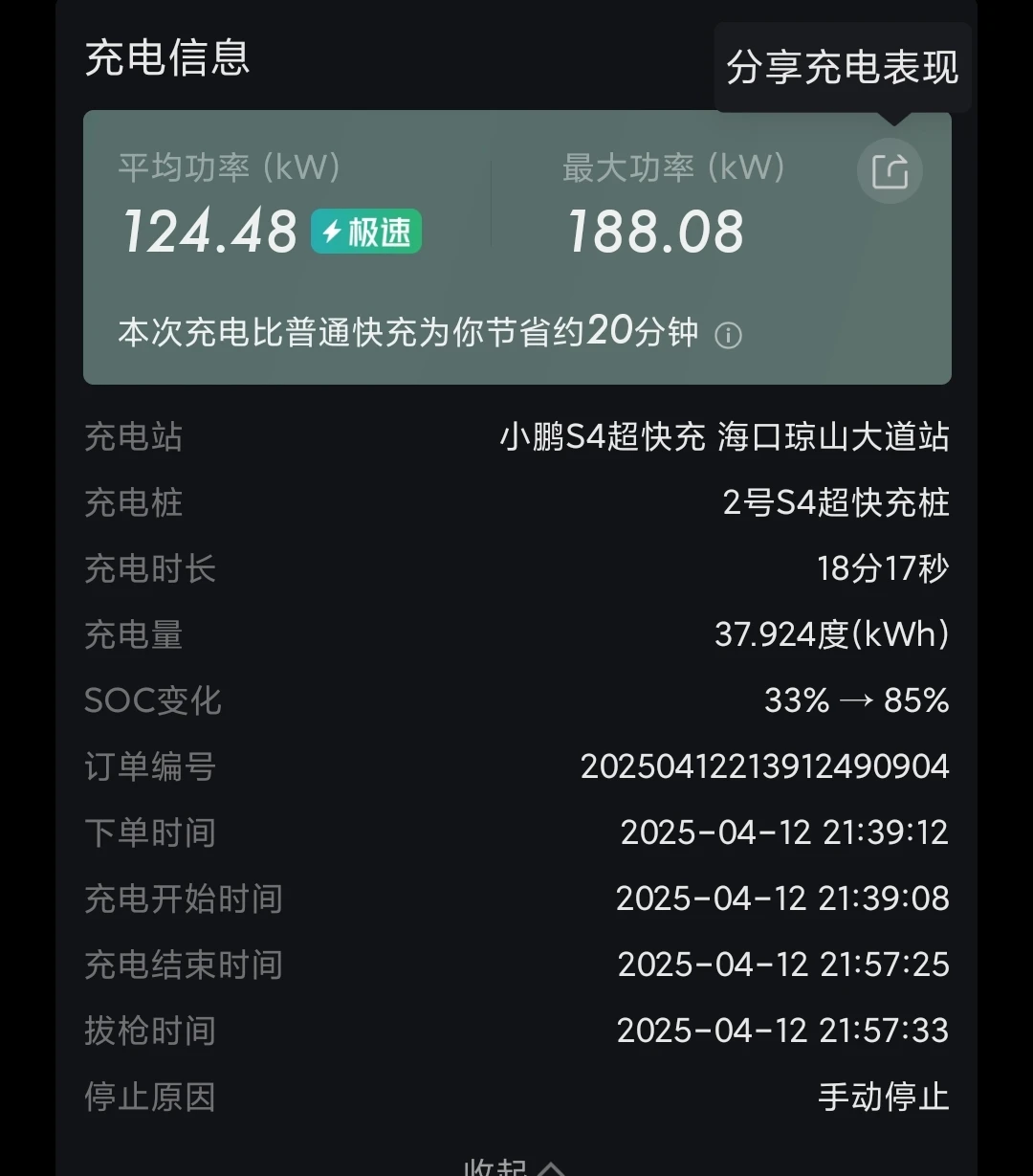 然后试了一下4S超充站快充,旁边还有一台车所以跑不满功率,18分钟从35到85,已经非常可观了不愧是800V的平台