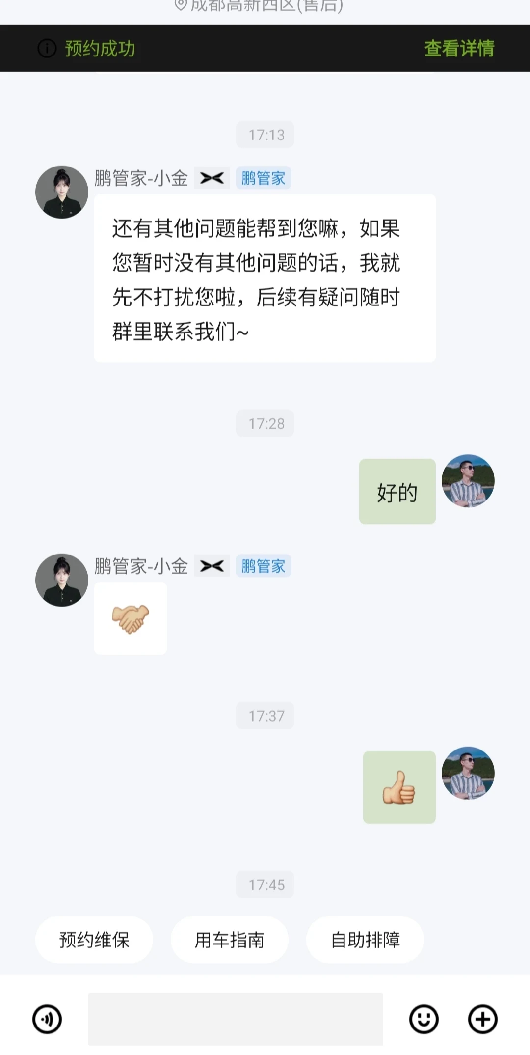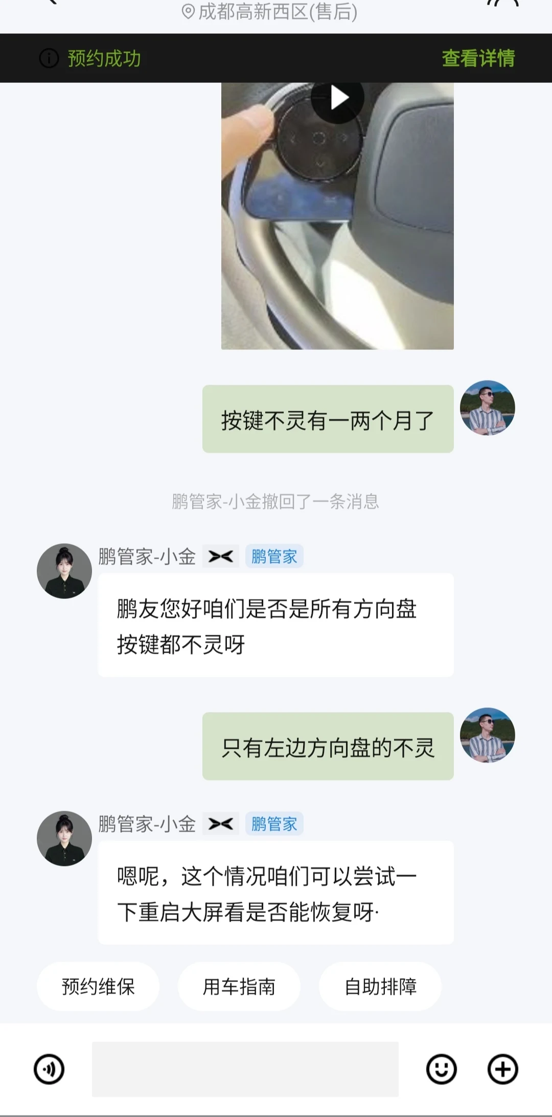 鹏管家-小金还是很认真负责的,五年老车主按键小毛病第一时间就安排售后了,👍点赞!
