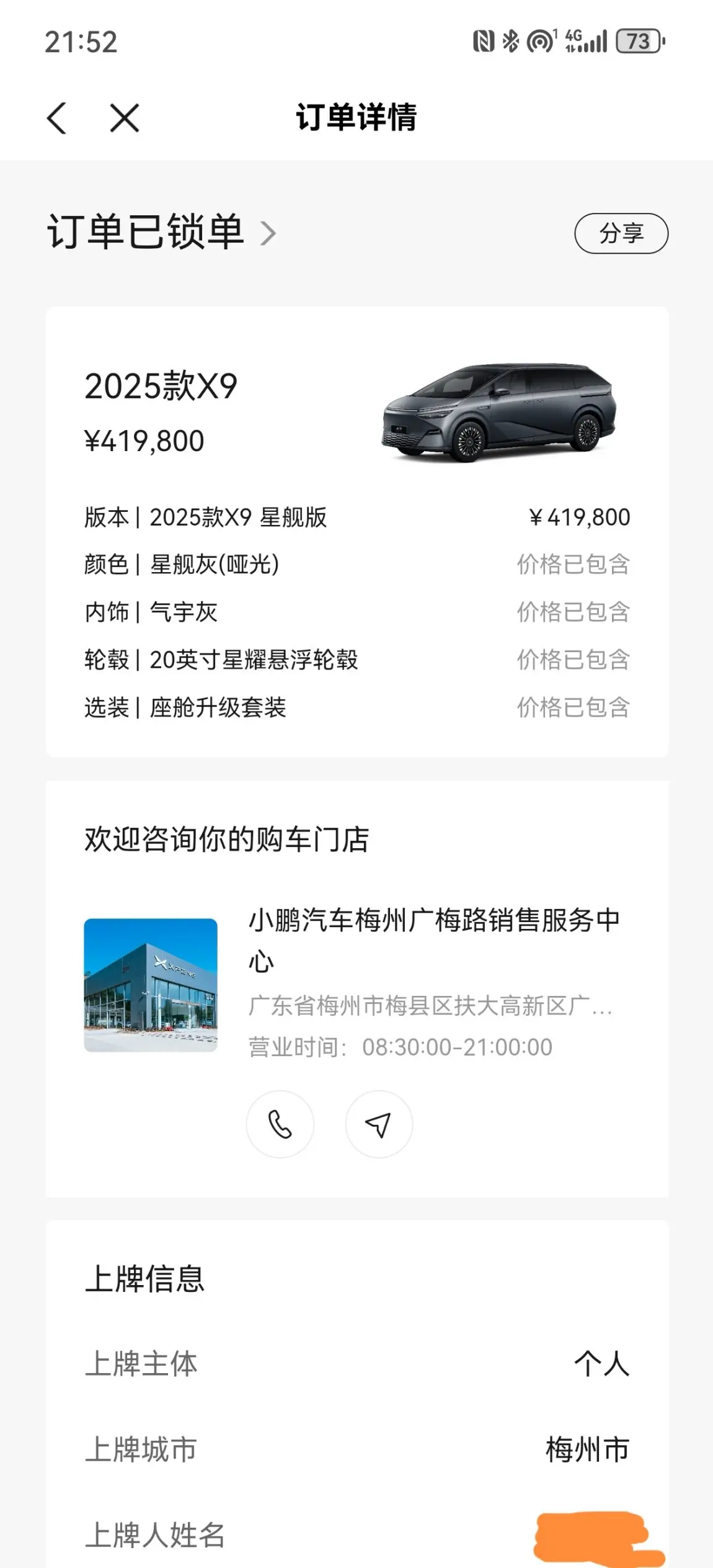 #晒2025款小鹏X9大定锁单# 从24年开始关注X9到现在下定,中间经过了十分多的对比,最后终于下定决心定了X9。 作为一个拥有两个小孩,两位老人的家庭来说,这款车真的是无比的契合。我跟爱人想要的东西都有了,孩子想要的东西都有了,父母想要的东西也有了。这所有的犹豫都没有了,果断下定。同时也庆幸自己成为2025款x9的首批车主。