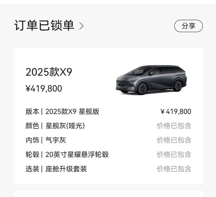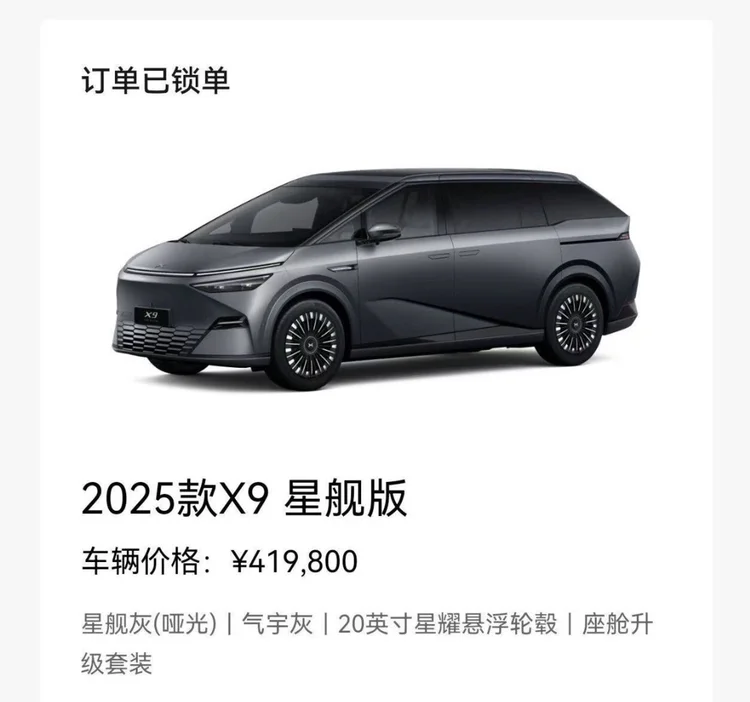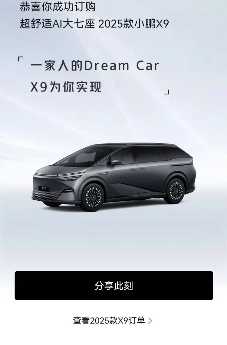 #晒2025款小鹏X9大定锁单# 小鹏x9下定啦,冲冲冲! 2025年,交个鹏友!小鹏x9下定啦,冲冲冲! x9的价格还是很有诚意的呀,比预想的还要给力,直接催着销售锁单,希望能在一月提车!!!小鹏x9冲冲冲! 优点可概括为以下几点:智能科技领先,具有高级自动驾驶功能。外观设计时尚,符合现代审美。内饰豪华,注重细节品质。续航能力出色,电动车性能优秀。空间宽敞,舒适度高。动力性能良好,加速顺畅。总体来说,小鹏X9是一款集高科技、时尚设计、豪华品质、出色性能于一体的优秀电动车型。
