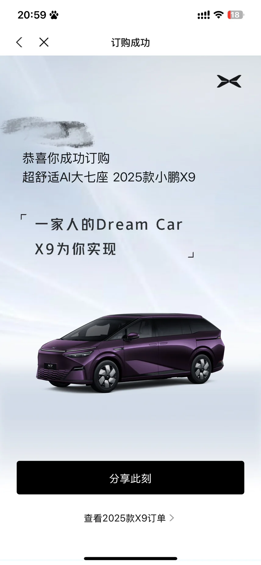 下定了2025款小鹏X9!等了一个多月,从预售发布会的惊吓到正式上市的惊喜,最终毫不迟疑的锁下!很早就关注x9,相比老款,新款还是让人特别心动的。特别是新增加了三个颜色,赋予了这款mpv更多适用场合,也是我个人觉得性价比极高的一款家用mpv,正如图片所说的,一家人的dream car。期待能快点提车,驾驶着它享受旅途的美好!