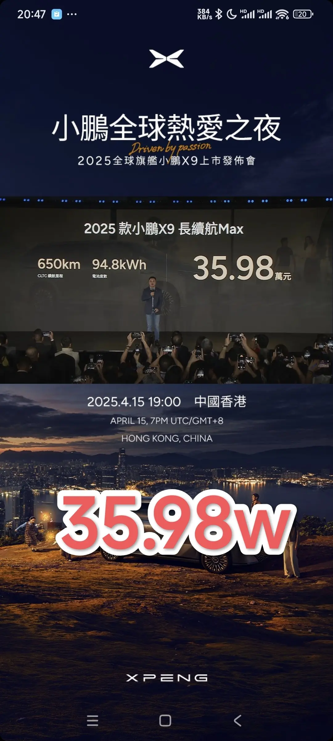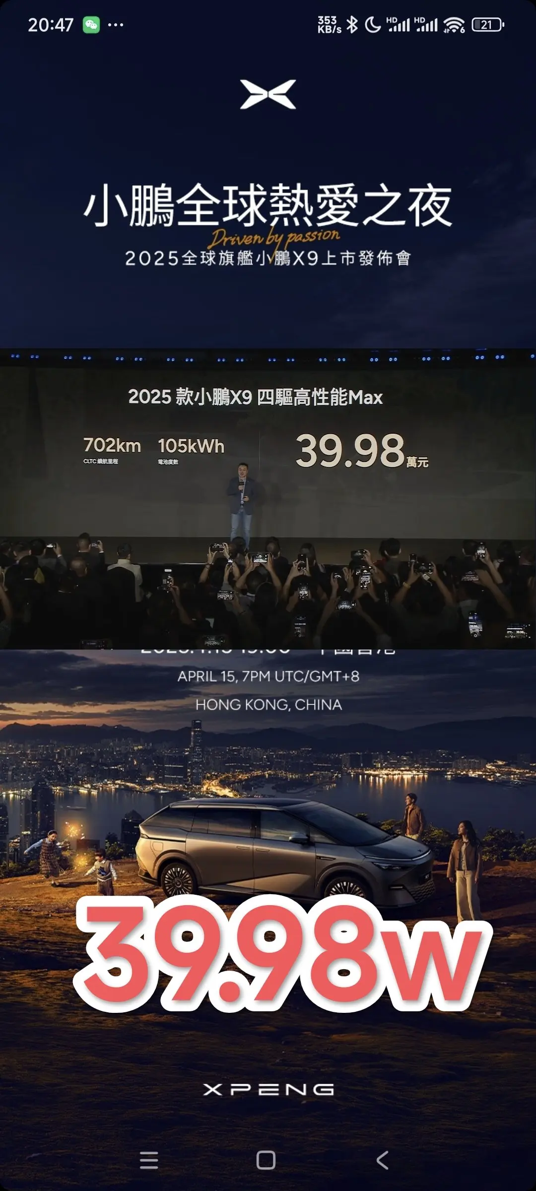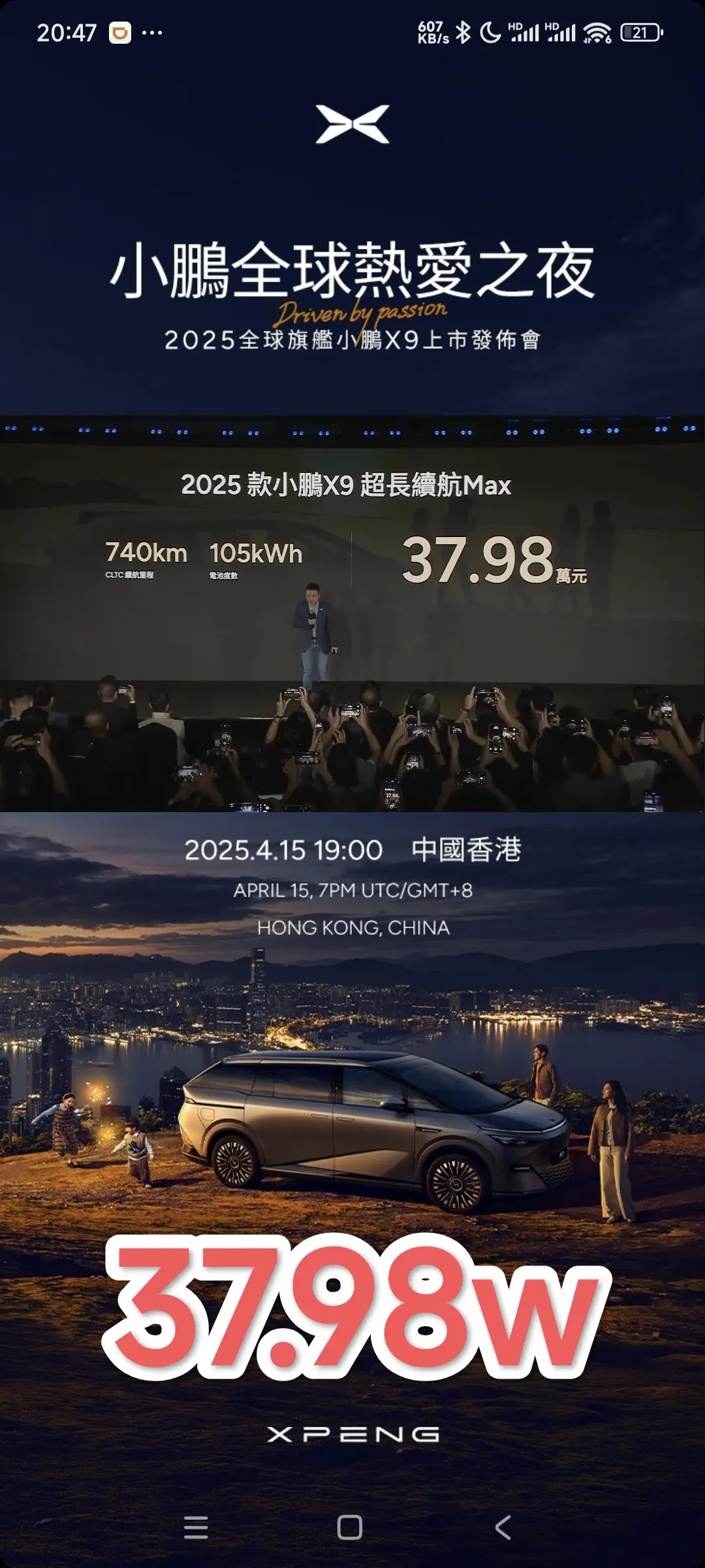 4月15日“全球热爱之夜”在香港举办,发布X9的同时宣布智驾技术适配右舵交规,计划在欧洲部署大模型驱动的LCC功能,为L3/L4级自动驾驶铺路。