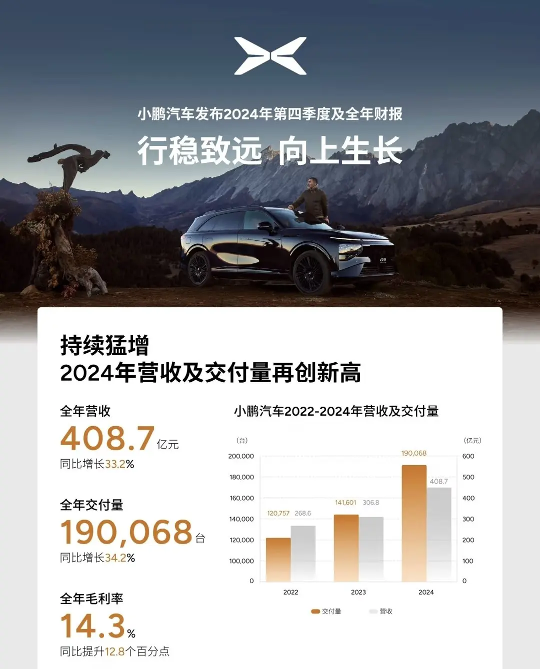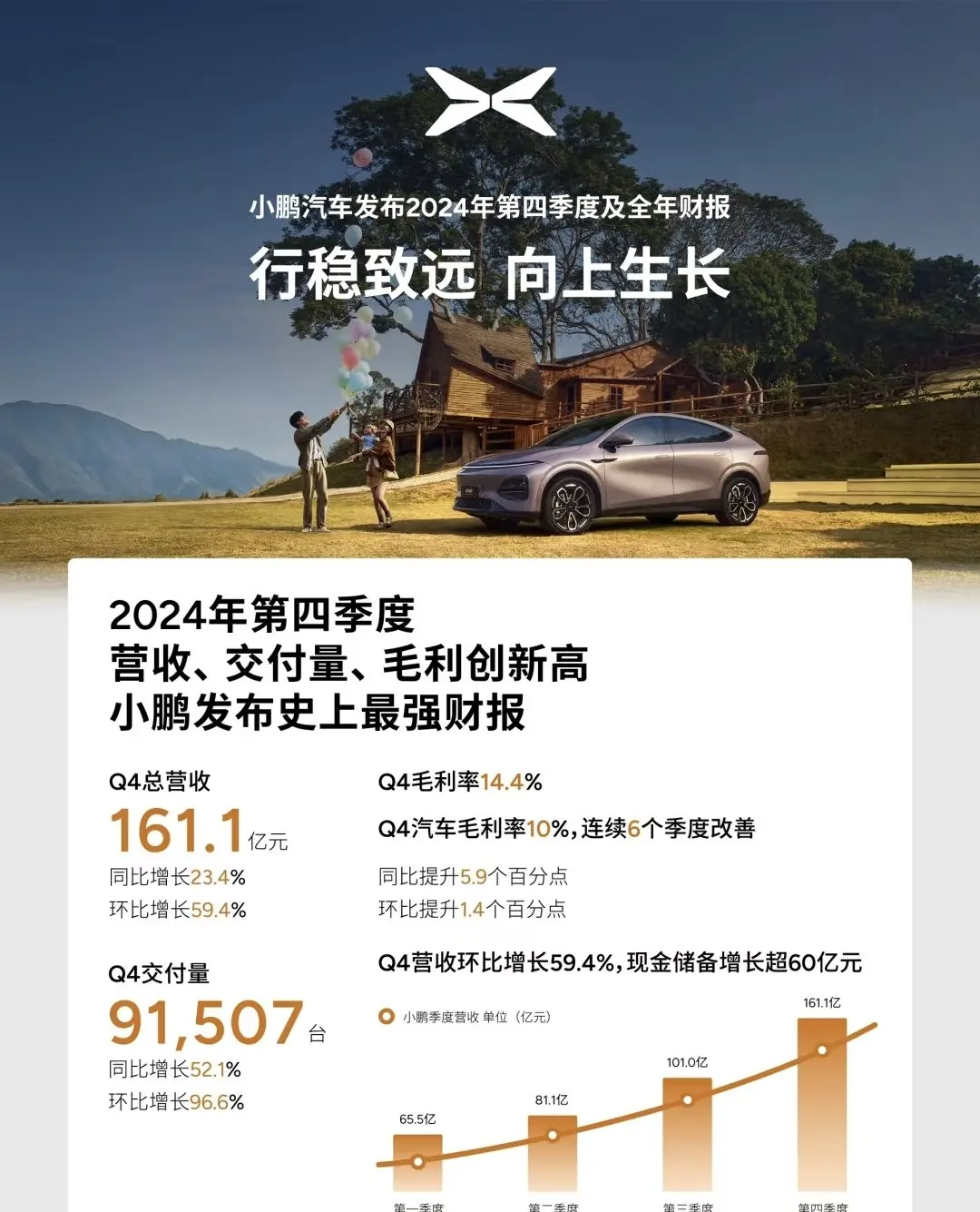 营收增长:2024年第四季度营收161.1亿元,同比增长23.4%;全年交付量19万辆,同比增长34.2%。