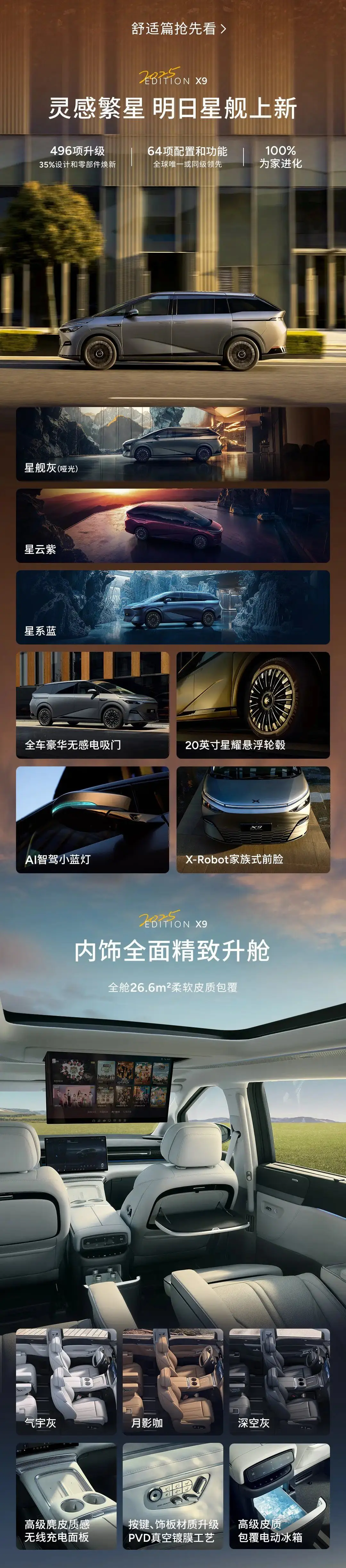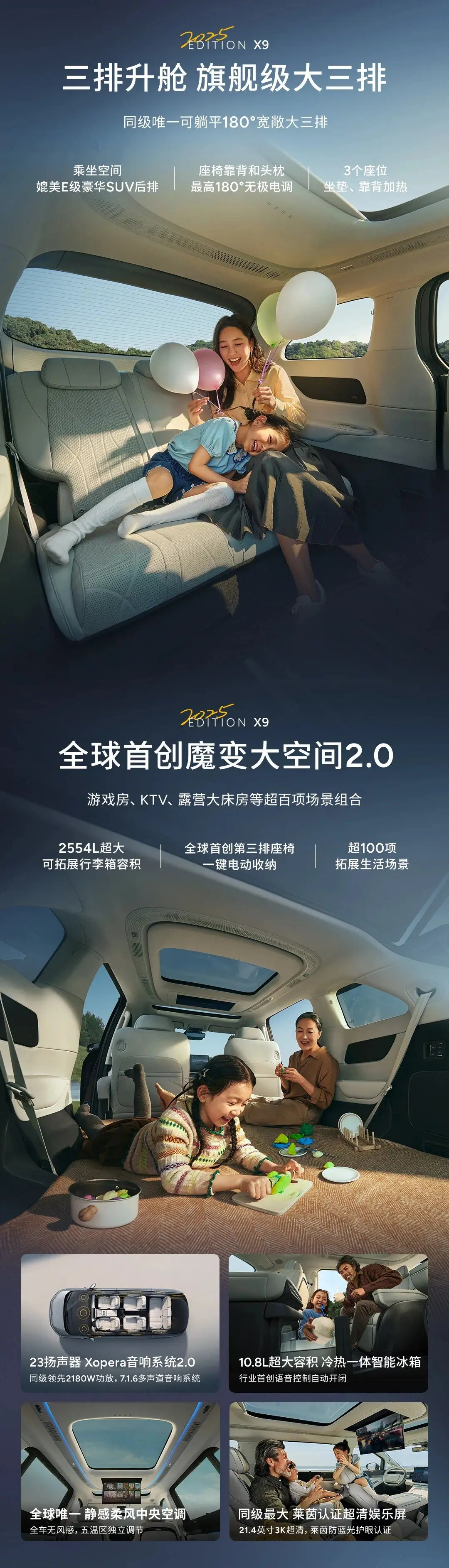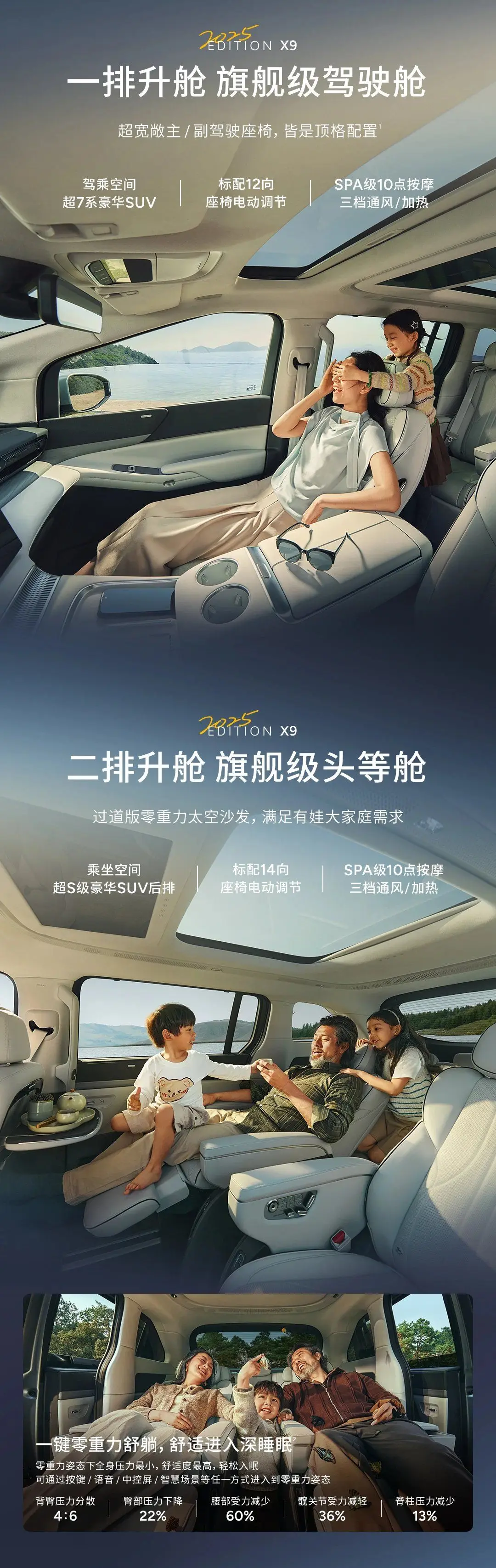 • 零重力座椅体验:2025款小鹏X9配备了全球唯一全系标配过道版零重力太空座椅。你们可以一键切换至“零重力模式”,全身压力均匀分布,即使在长途旅行中也能轻松享受极致的舒适感。