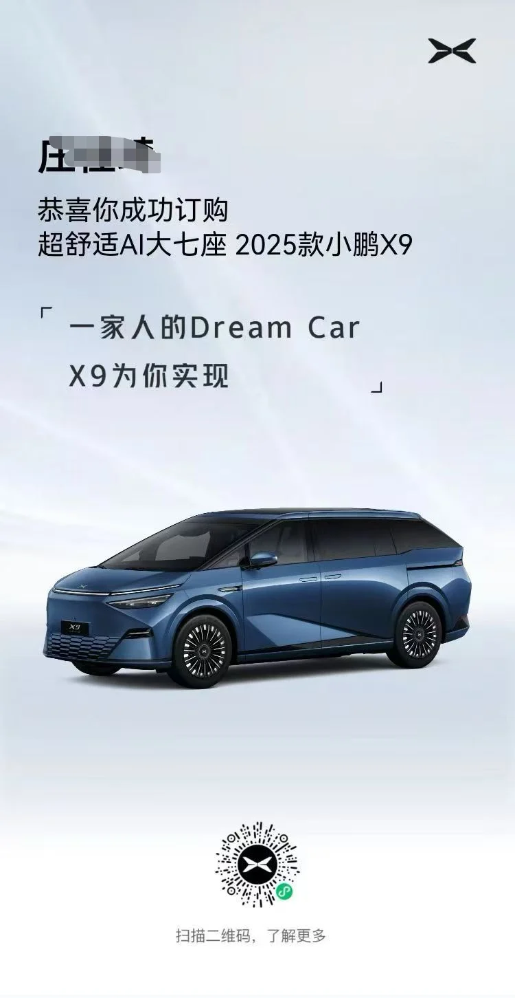 #晒2025款小鹏X9大定锁单# 纠结版本纠结颜色,选择困难症,最后终于在看到新款展车及试驾车试了试之后锁单了,的确是梦中爱车,空间大,操控好,后备箱也优秀,最喜欢在第二排躺着小憩一会儿,总而言之,期待提车那天!!!