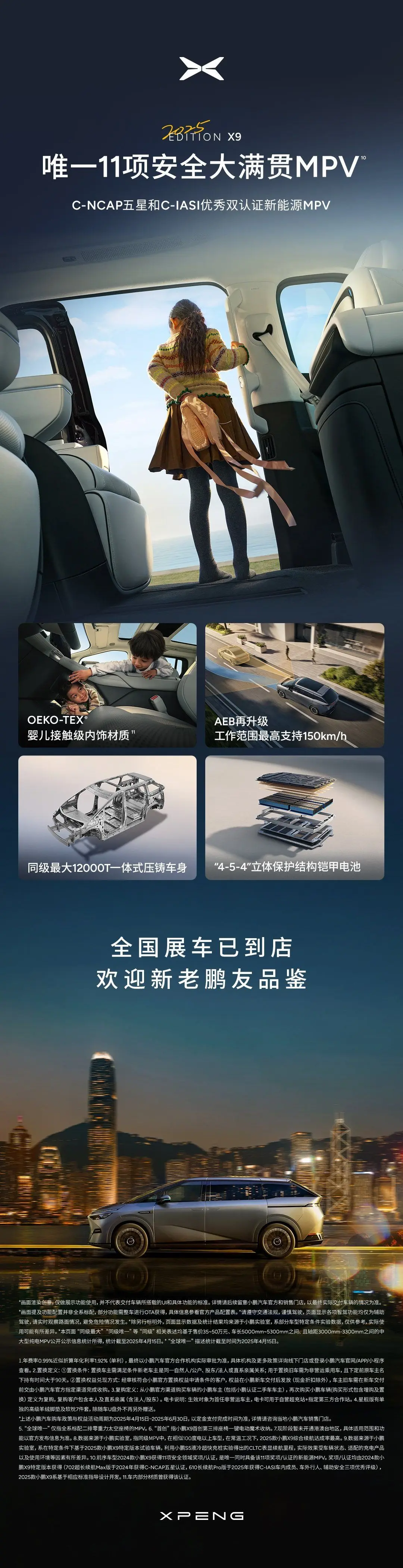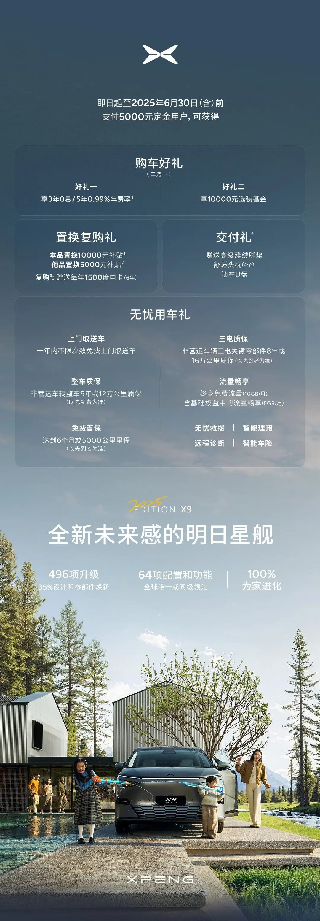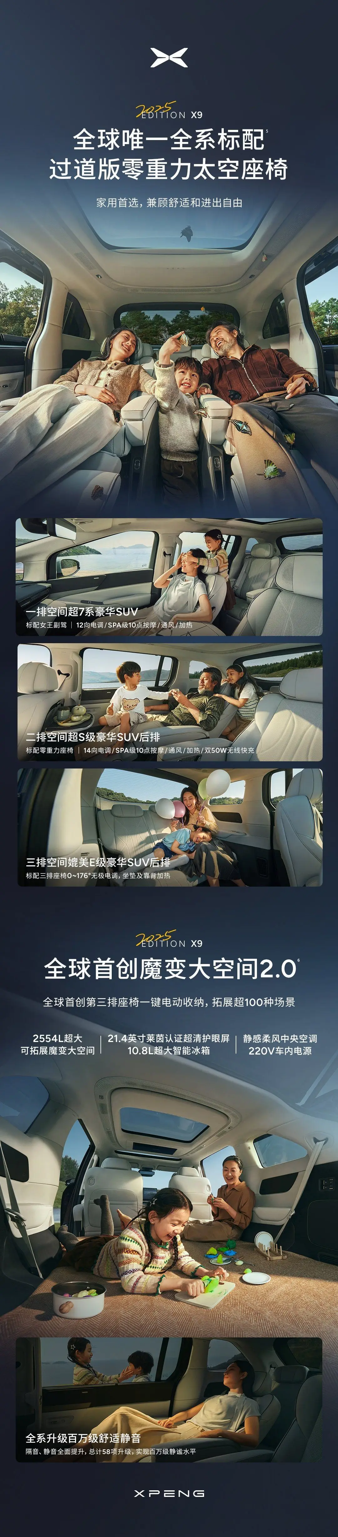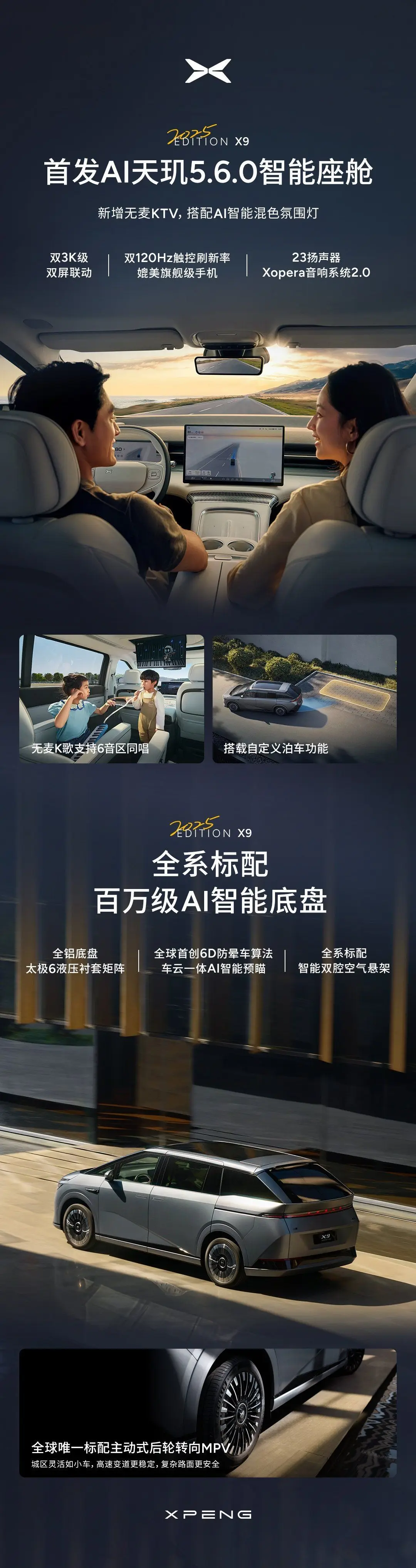 2025款小鹏X9以“全面升舱”为核心,实现商务舱到头等舱的跨越式升级。新车共推四款车型,售价35.98万-41.98万元,在配置全面加码的同时保持价格竞争力:650长续航Max版标配5C超充电池,740超长续航Max版续航达740km,702四驱高性能Max版零百加速5.7秒,星舰版更配备无铬鞣真皮座椅及16点按摩 。全系标配图灵AI智驾、主动后轮转向及百万级NVH静谧性 ,新增哑光星舰灰车漆、20英寸星耀轮毂等选装配置,万元选装基金可提升座舱豪华体验 。叠加3年0息等权益,实现“加量不加价”的高性价比优势。