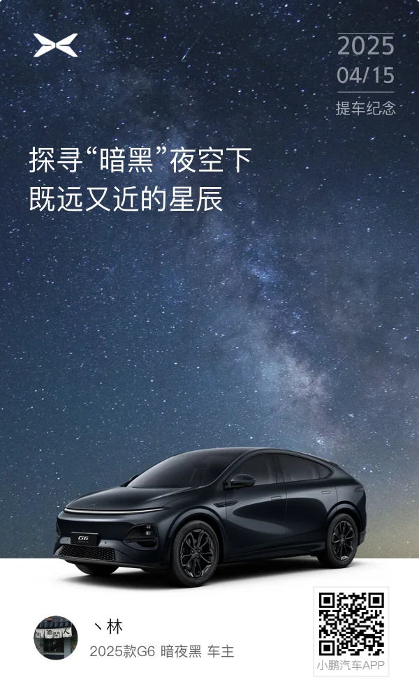 #全新小鹏G6首批车主火热提车# 3月17日订车,4月15日终于喜提25款G6!黑武士在阳光下无敌帅,无框车门+隐藏把手科技感拉满。内饰座椅包裹性极佳,XNGP智驾系统丝滑流畅,城市路段自动避让行云流水。800V充电平台,5C超充AI电池,彻底告别里程焦虑。从订车到交付全程透明,小鹏的服务细节值得点赞!接下来的日子,和小鹏一起持续进化,满电出发~