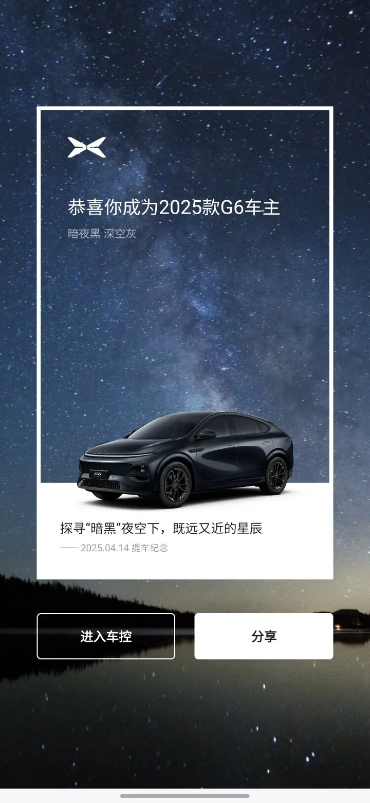 #我的提车作业# 接到交付通知可以去提车,抑制不住的喜悦,冲出屏幕。一看日子,4月14日,似乎不是黄道吉日。转念一想,也行,按音乐发音重读即可,发呀发。见到小6的那一刻,除了惊艳还是惊艳。黑武士配色,绝美。办完所有手续,开着小6,风风火火往家敢,路上试了智驾,基本能应对一些复杂交通状况。不负热爱!当然,属于我跟小6的故事正在路上,人机互动还要摸索,智慧应用还要探索,鹏友之路还要求索。
