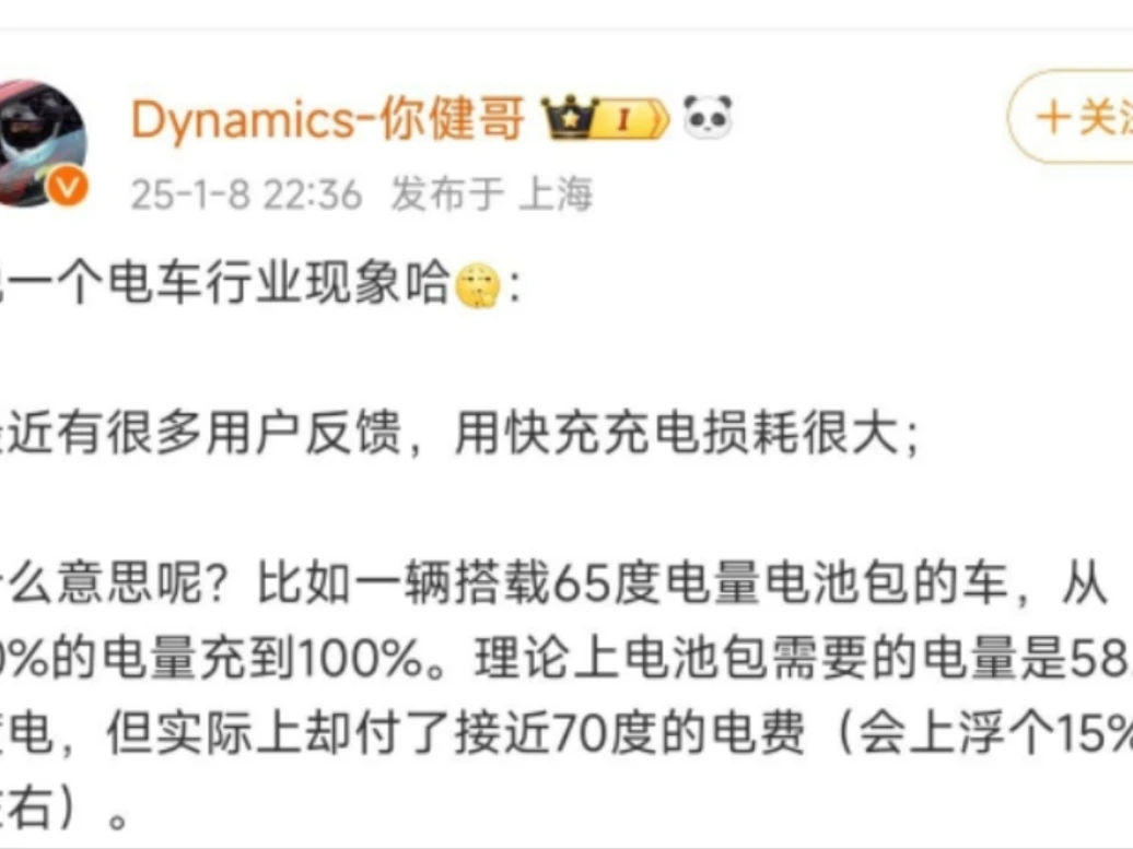 什么意思呢?比如一辆搭载65度电量电池包的车,从10%的电量充到100%。理论上电池包需要的电量是58.5度电,但实际上却付了接近70度的电费(会上浮个15%左右)。