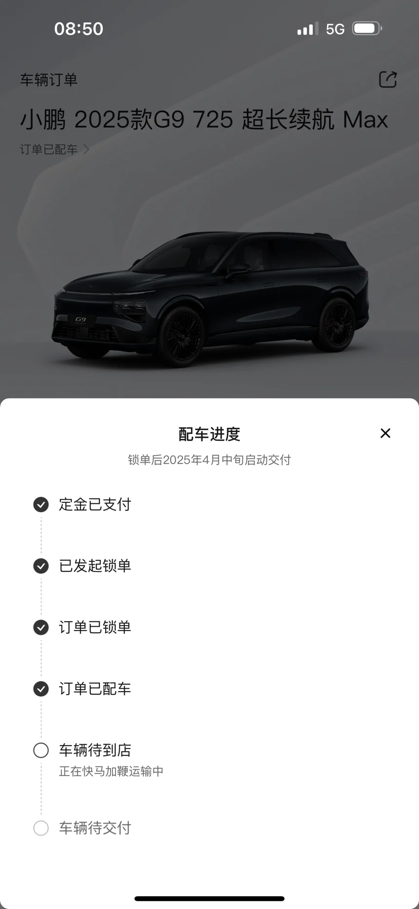 心心念的G9终于配车啦,18号晚上锁单,今天一早收到短信,车在路上啦,开心了好一会儿,也希望还没配车的鹏友们,早日收到配车短信啦