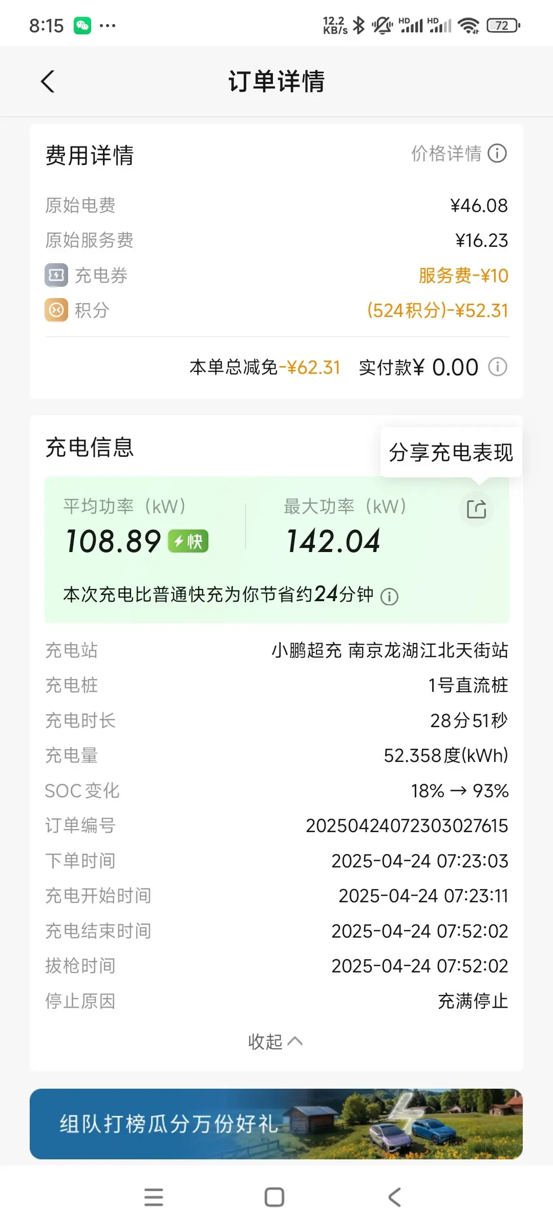插上充电枪的那一刻,直接被它的速度惊到。原本还担心电量低会影响充电速度,没想到瞬间功率就攀升到260kW,电压稳稳保持在800V。看着电量百分比和续航里程快速增长,这种感觉太奇妙了。短短10分钟,就充进了100多公里的续航。从18%充到93%,也仅仅花了28分钟。充电量52.385度,理论充电量试剂50度,充电损耗:(52.385-50)/50=4.77%,非常棒得体验。