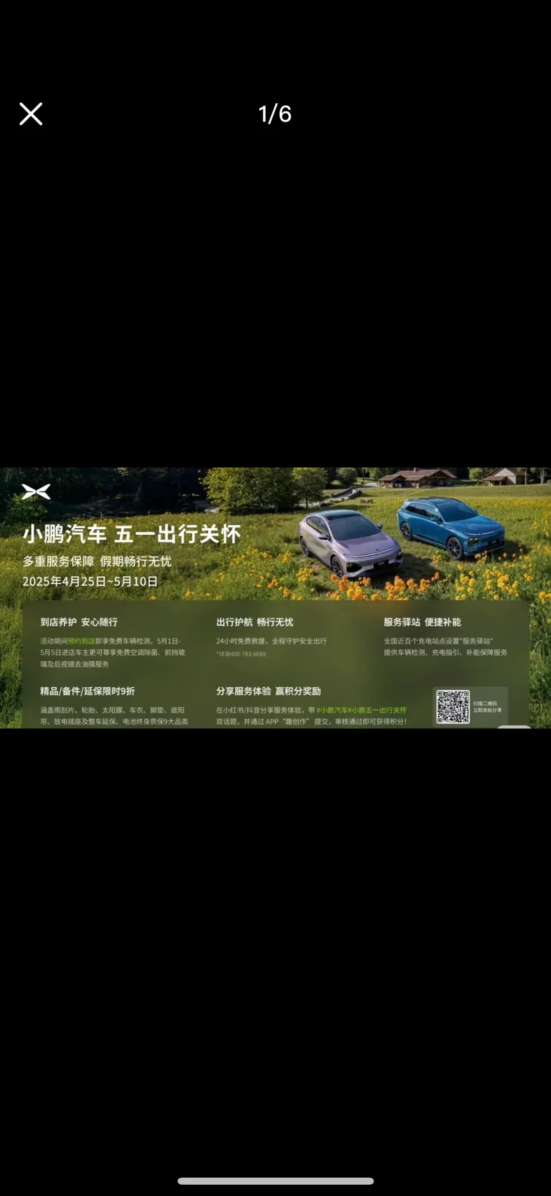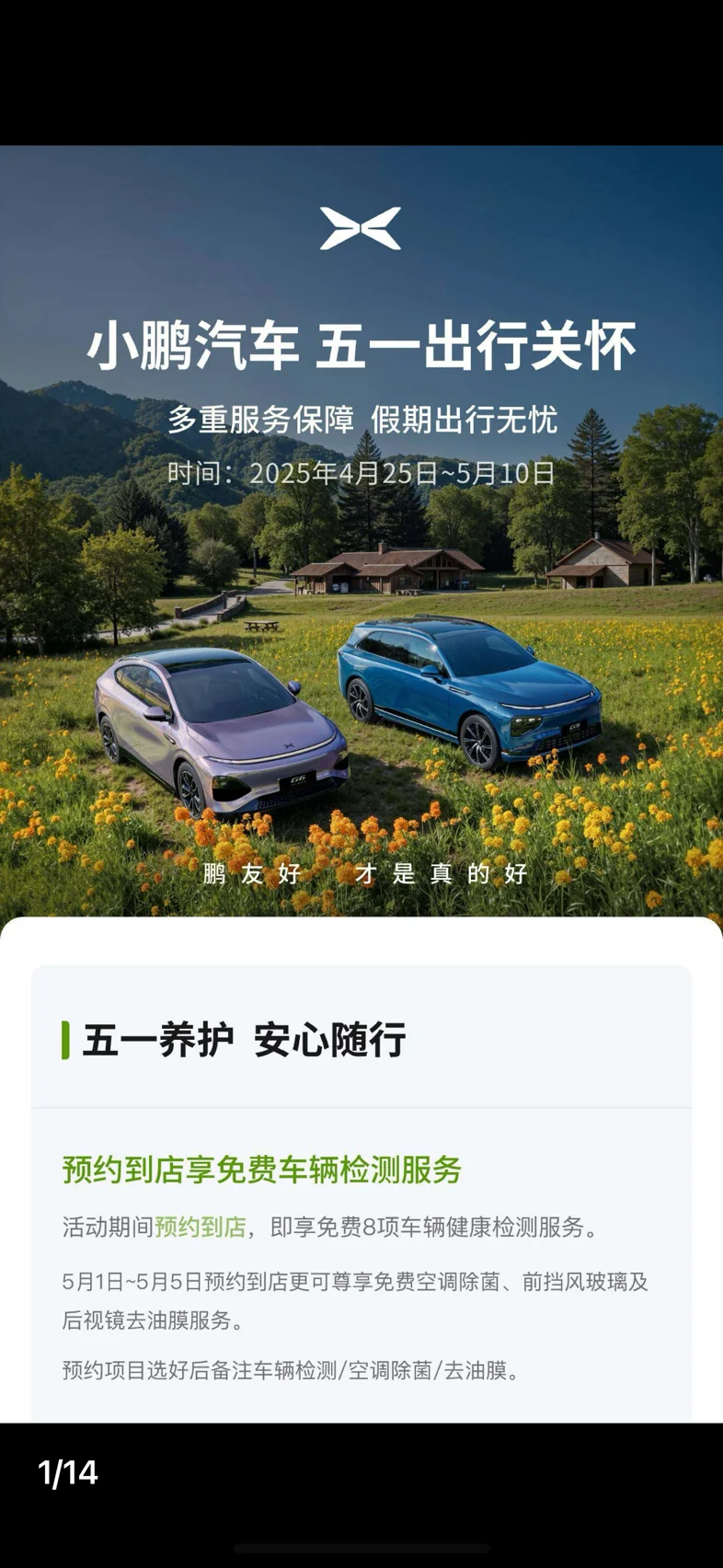 - 其他福利:精品/备件/延保限时九折,售后提供30公里内免费上门取送车服务,部分车主到店检修还有机会获赠小鹏专属雨伞。 #小鹏汽车 #小鹏五一出行关怀