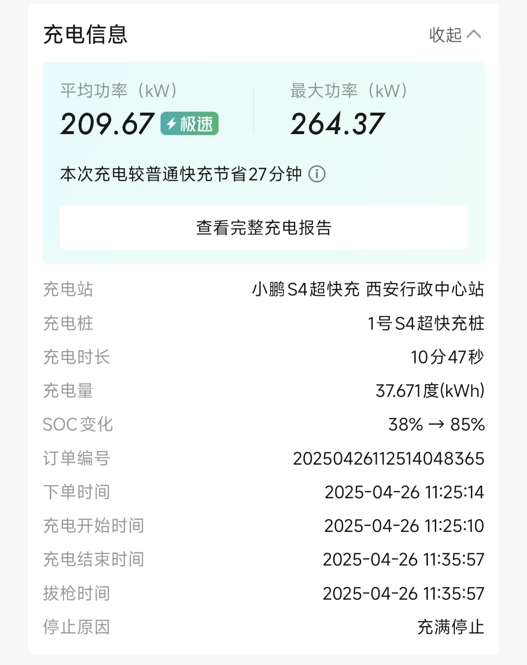 第一次体验5C电池+小鹏超快充的双重魅力,10分钟从38%充至85%,最大充电功率达到264KW,体验太好了,五一出行毫无补能焦虑!!
