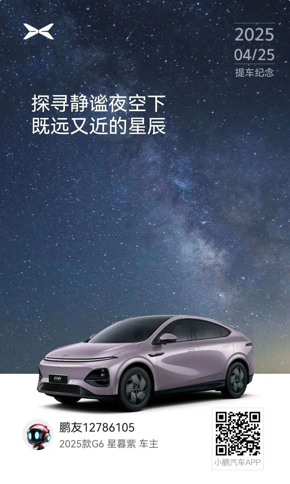 为了考虑之后带宝宝出行方便,所以买了家里的第二台车。试驾了多款车之后,毫不犹豫地选择了小鹏G6,紫色的实车真的太好看啦!!!从锁单到提车等了31天,值得的!
