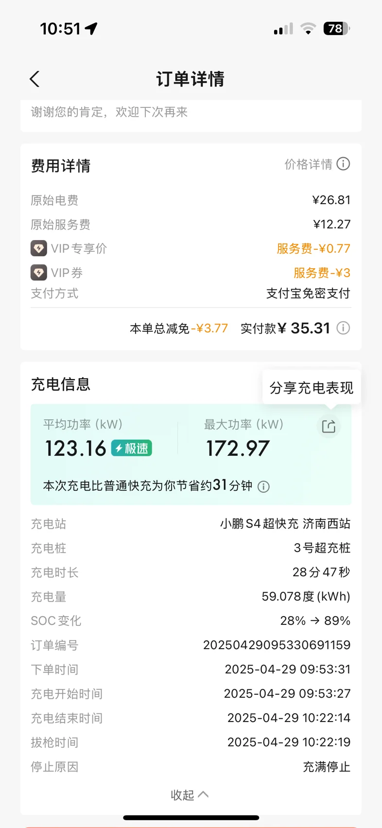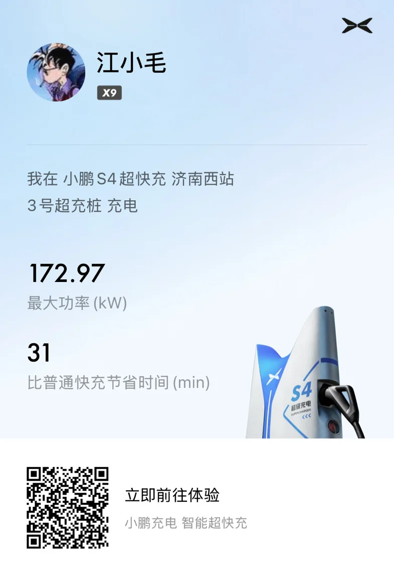 #风景在窗外流动,小鹏在身后同行# 提车2周以来一直在单位充电,价格便宜,可是慢充,通常早晨插上枪,下班才能充满,甚至会差一点。赶上今天送朋友出行,提前搜索了地图,分别后就奔着小鹏超充来了😏不太走运的是1号枪超充在维修,体验的普通快充,其实速度也还好,基本上半个小时上个卫生间抽根烟的功夫续航增加了300➕,不知道各位鹏友认为这个速度是否合格?有了这次经历我已经在憧憬五一出行了,个人认为半小时300➕的补能速度上不存在里程焦虑的@充电小助手