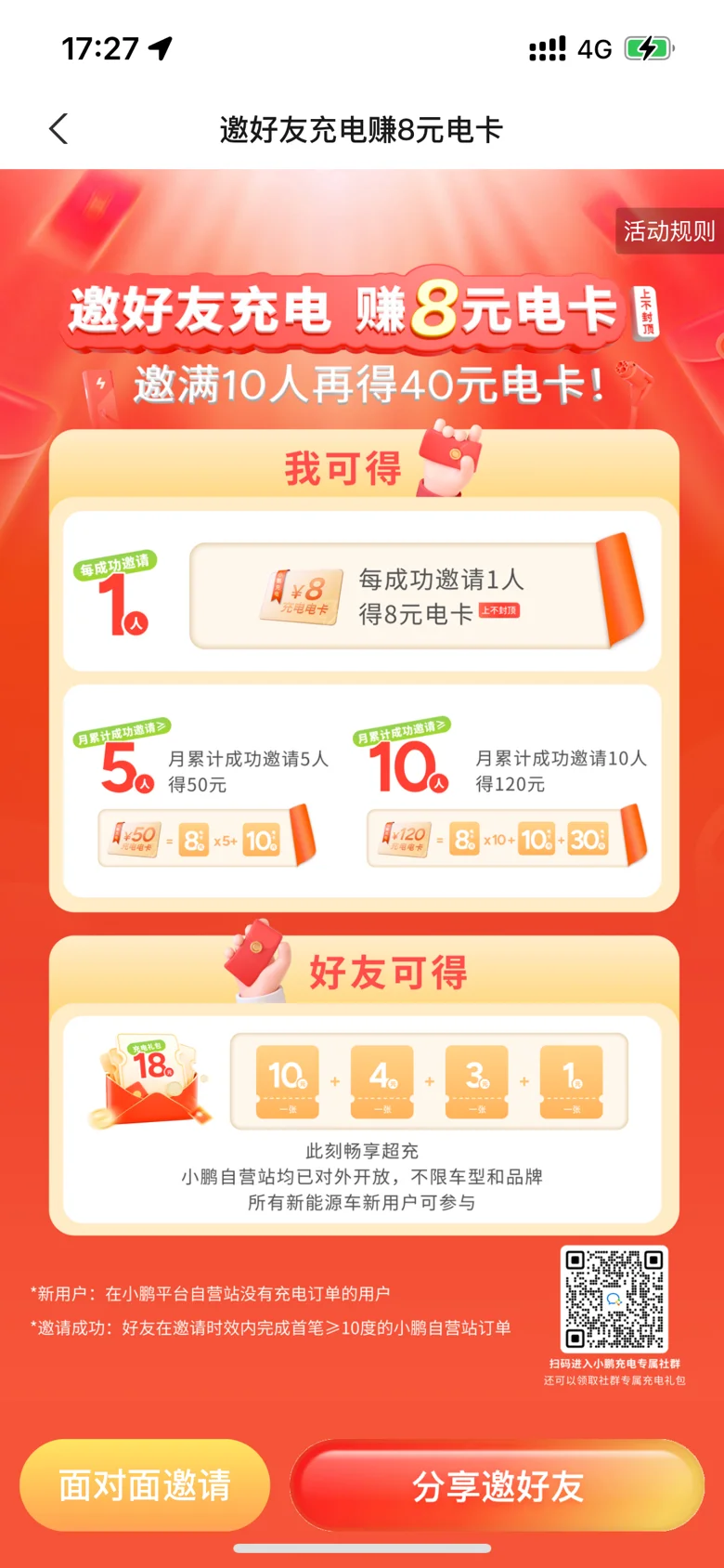 2. 别忘了请自己要好的鹏友邀请自己首次充电,赢电卡