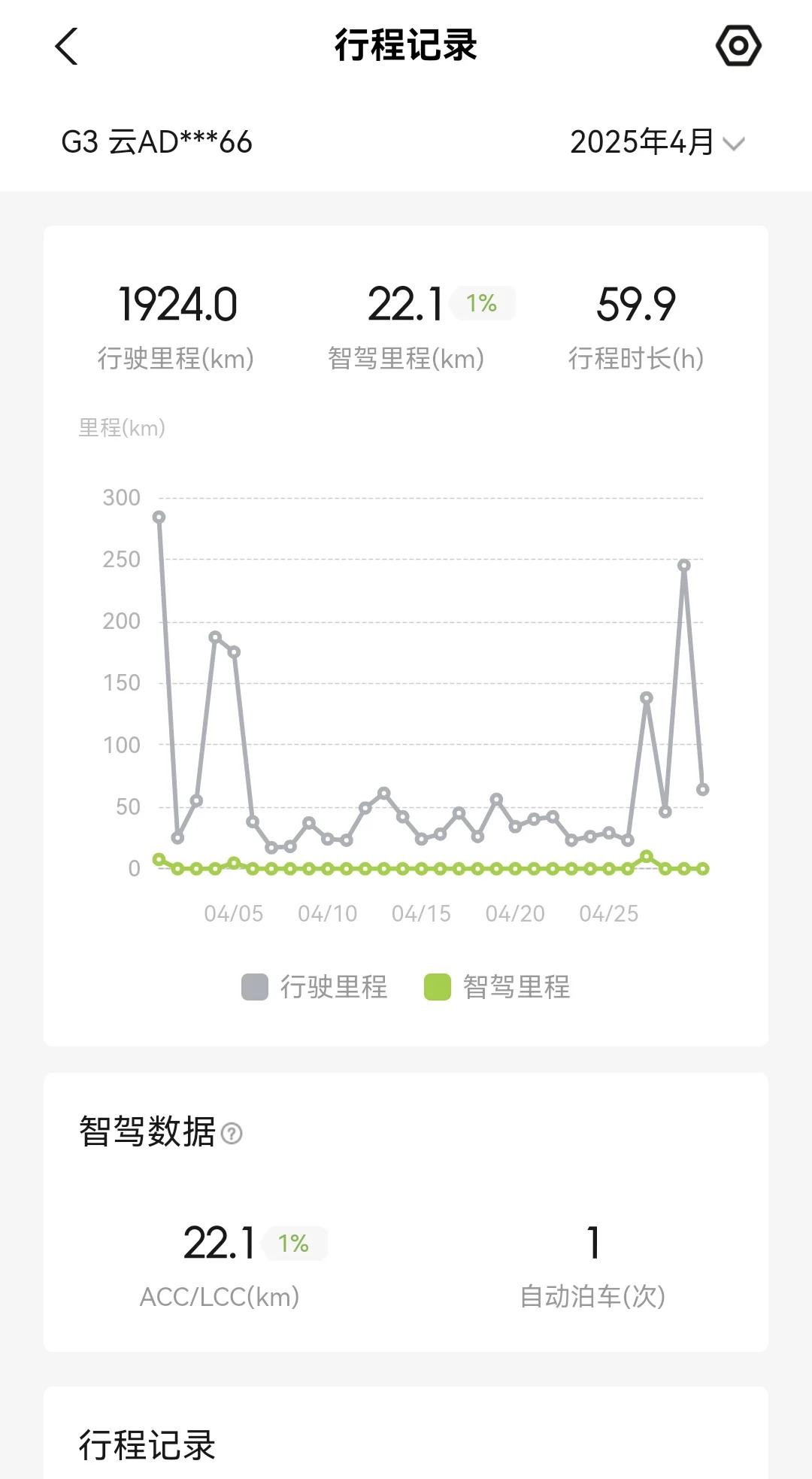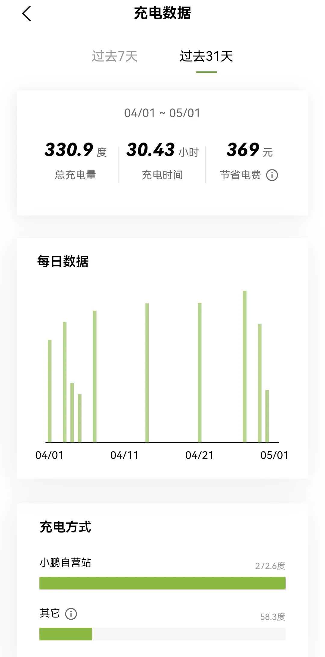 四月一共行驶1924公里,总充电330.9度,一度电约跑5.8公里。