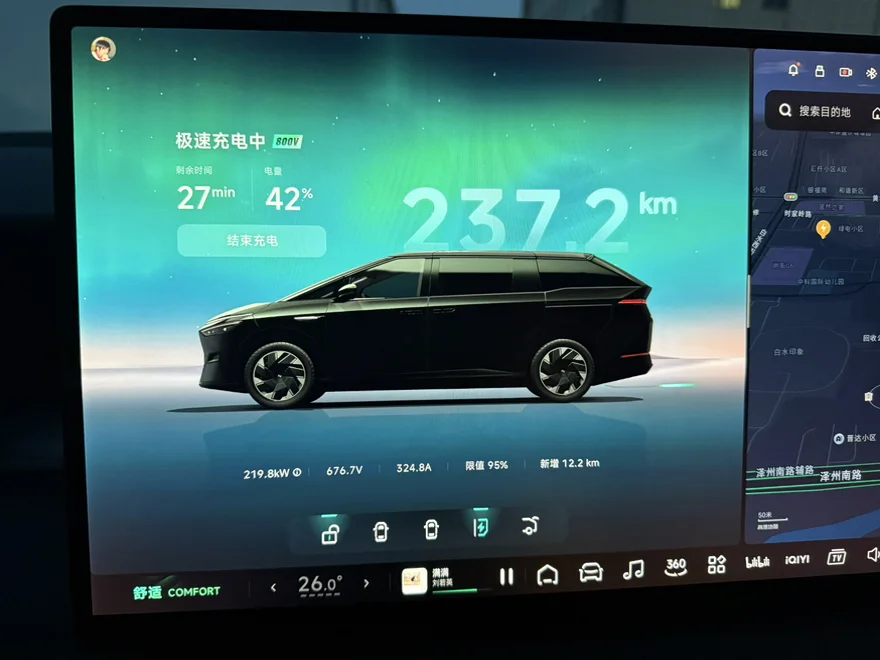 一大早到站,不得不小鹏s4的线很轻,插上枪自动开始充电,真方便。充电到95只用20多分钟,充到80只用了十几分钟,太快了。功率看了最高两百多千瓦,到了80还能有100千瓦左右,感觉非常好。b站一个节目没看完,就结束充电了。