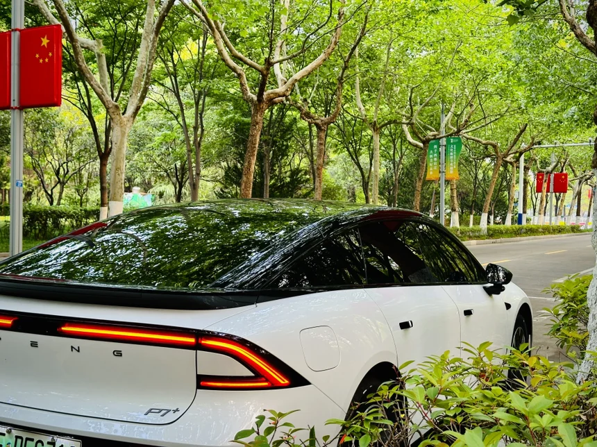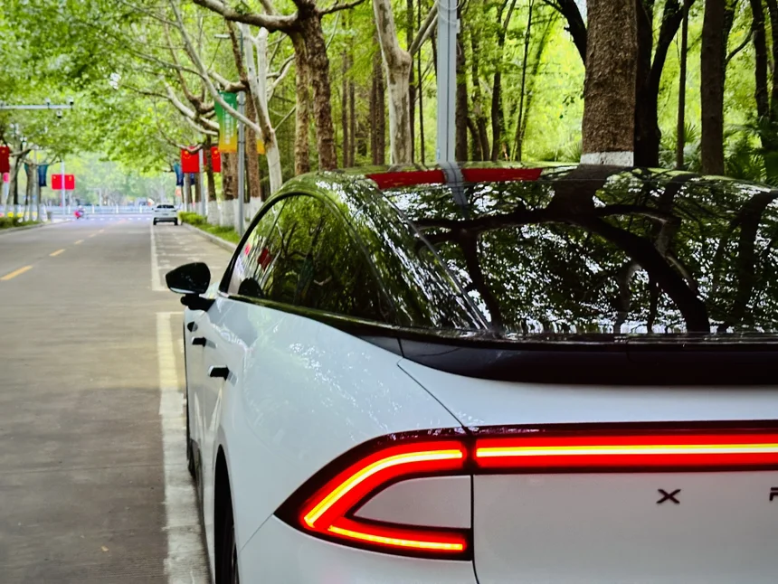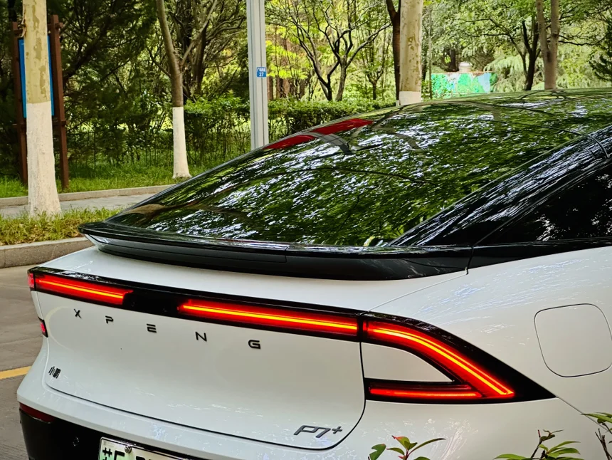 把车缓缓停下,站在路边再看小鹏P7+,流畅的线条、时尚的外观,在绿树的映衬下,愈发夺目。贯穿式尾灯和独特的车标,彰显着它的个性与魅力。