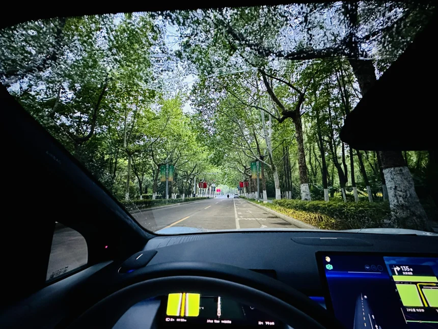 开着我的小鹏P7+,一头扎进了这条被绿意环抱的道路。光穿过层层枝叶,星星点点地洒在车身上,光影闪烁,美极了。🤭