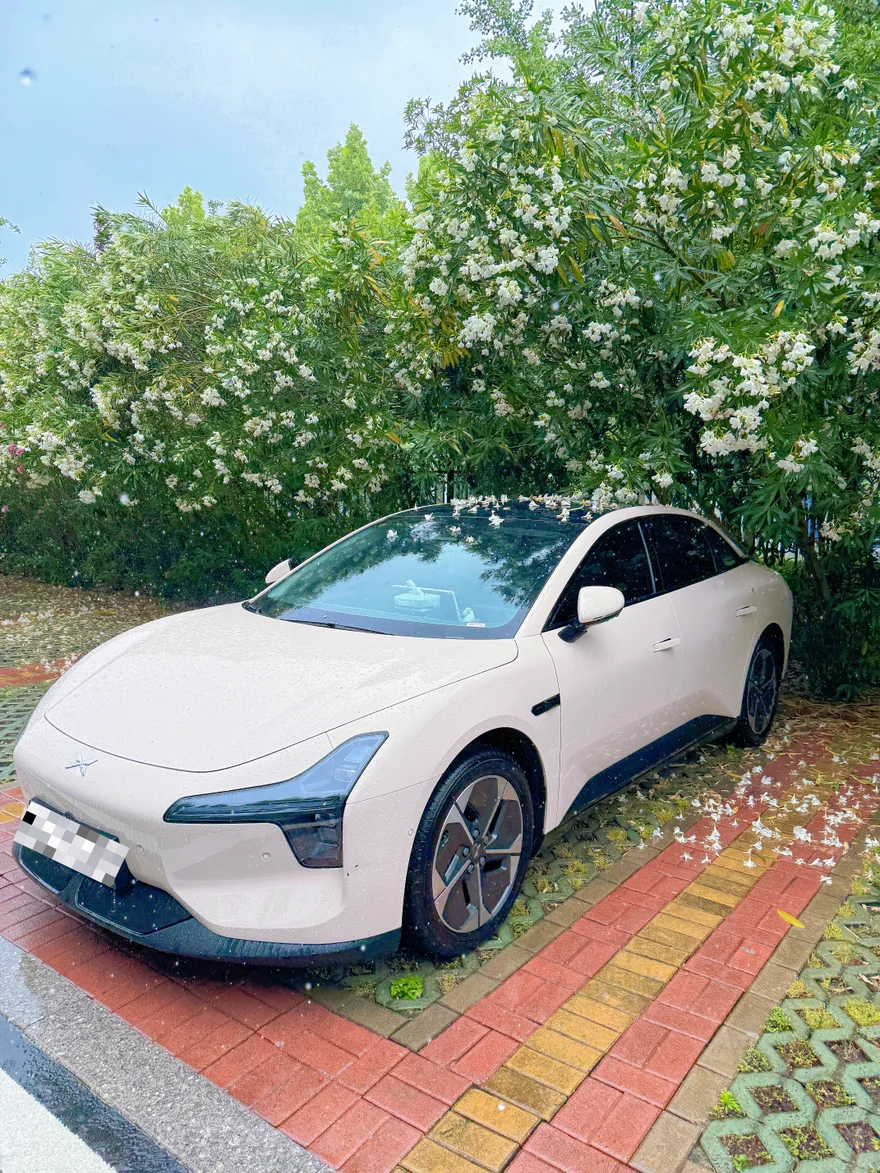 夹竹桃下小鹏车,雨落花飞似画图。花瓣轻沾车窗上,红妆翠影两相扶。雨丝如线织轻纱,夹竹桃花落小车。粉瓣沾泥香未减,春光一路伴君行。小鹏车静夹竹旁,雨打桃花瓣瓣香。落英满地情难尽,似诉春愁与梦长。#鹏友时光#