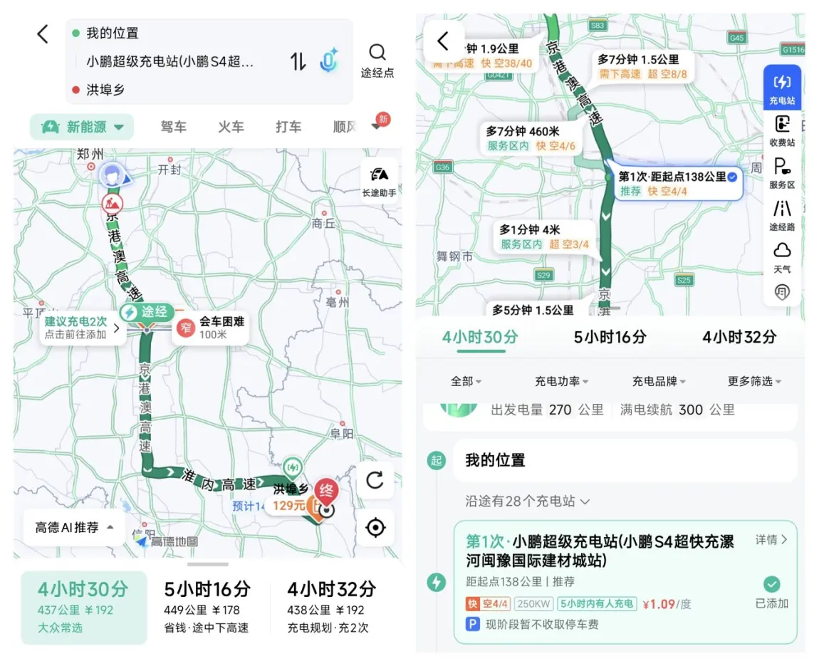 五一从郑州回老家信阳固始县,全程435公里左右,我的车是 G9 570MAX,wltp续航450,中间需要充一次电,我选择在京港澳漯河出口附近的小鹏自营站补能一次。