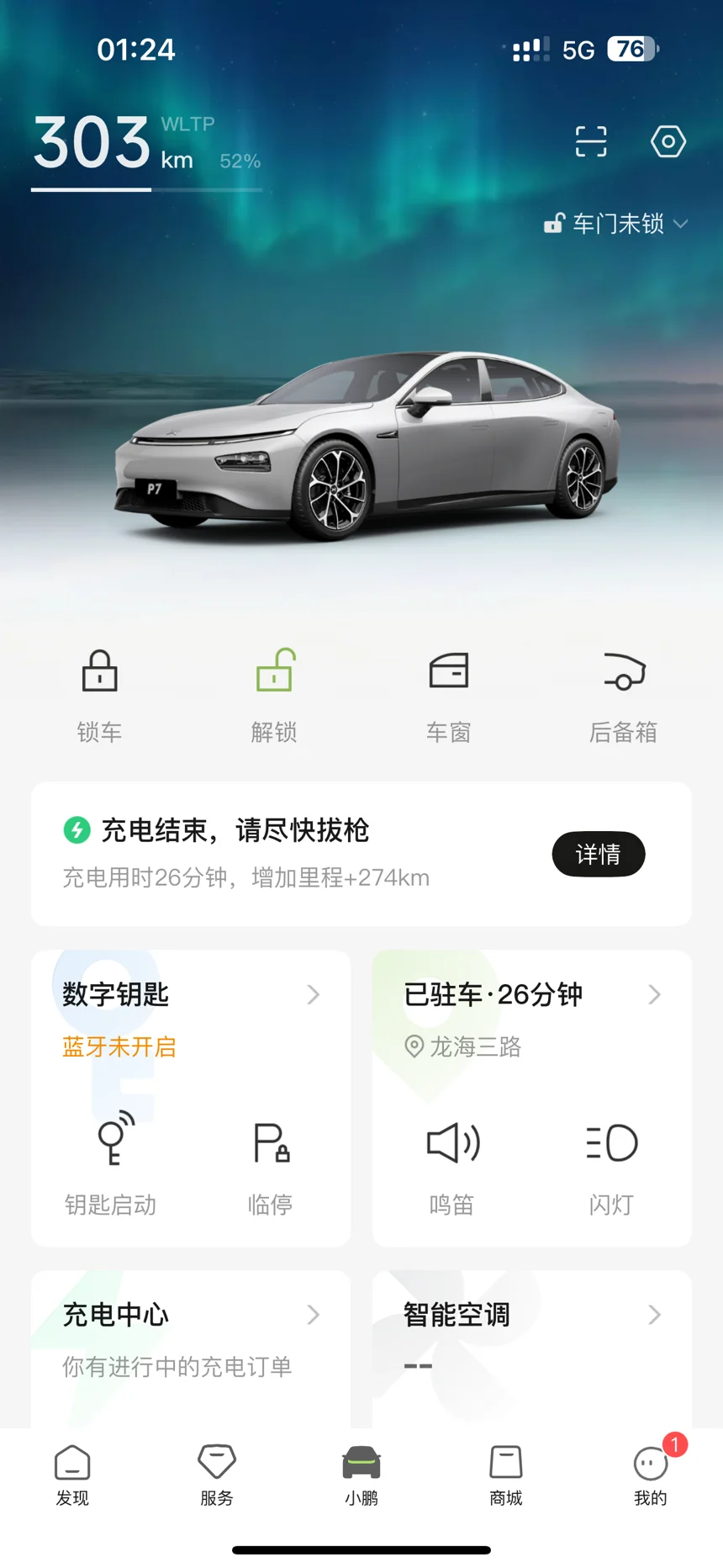 趁着充电的时间,我和家人来到附近的餐馆,吃了晚餐。不到半小时,我们就吃完了饭。回到充电桩前,我在小鹏APP上结束了充电。这次充电仅仅用了26分钟,车辆的续航里程就增加了274公里,WLTP电量也提升到了303公里。这样的续航对于我们在惠州市区这几天的游玩来说,完全足够了。